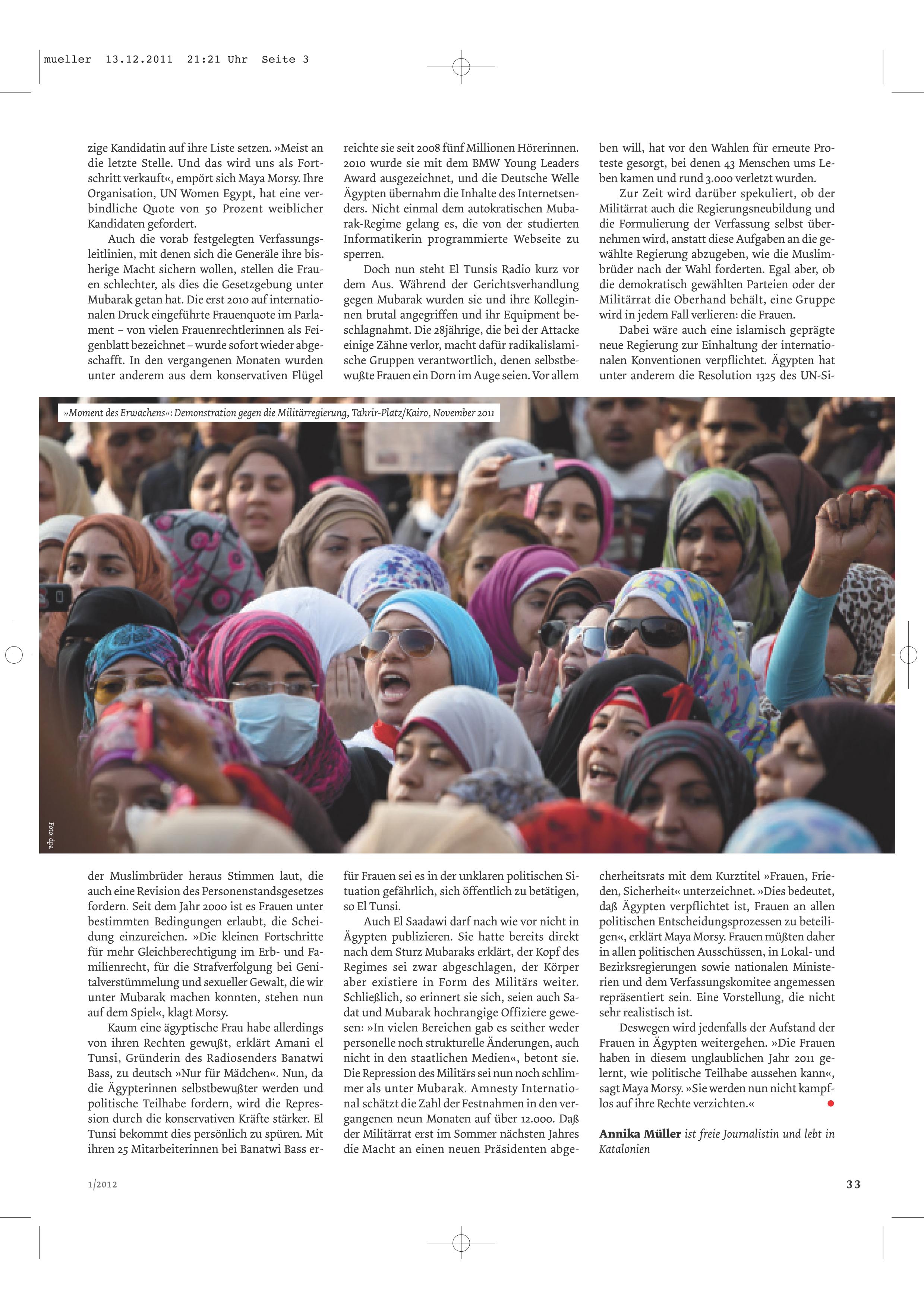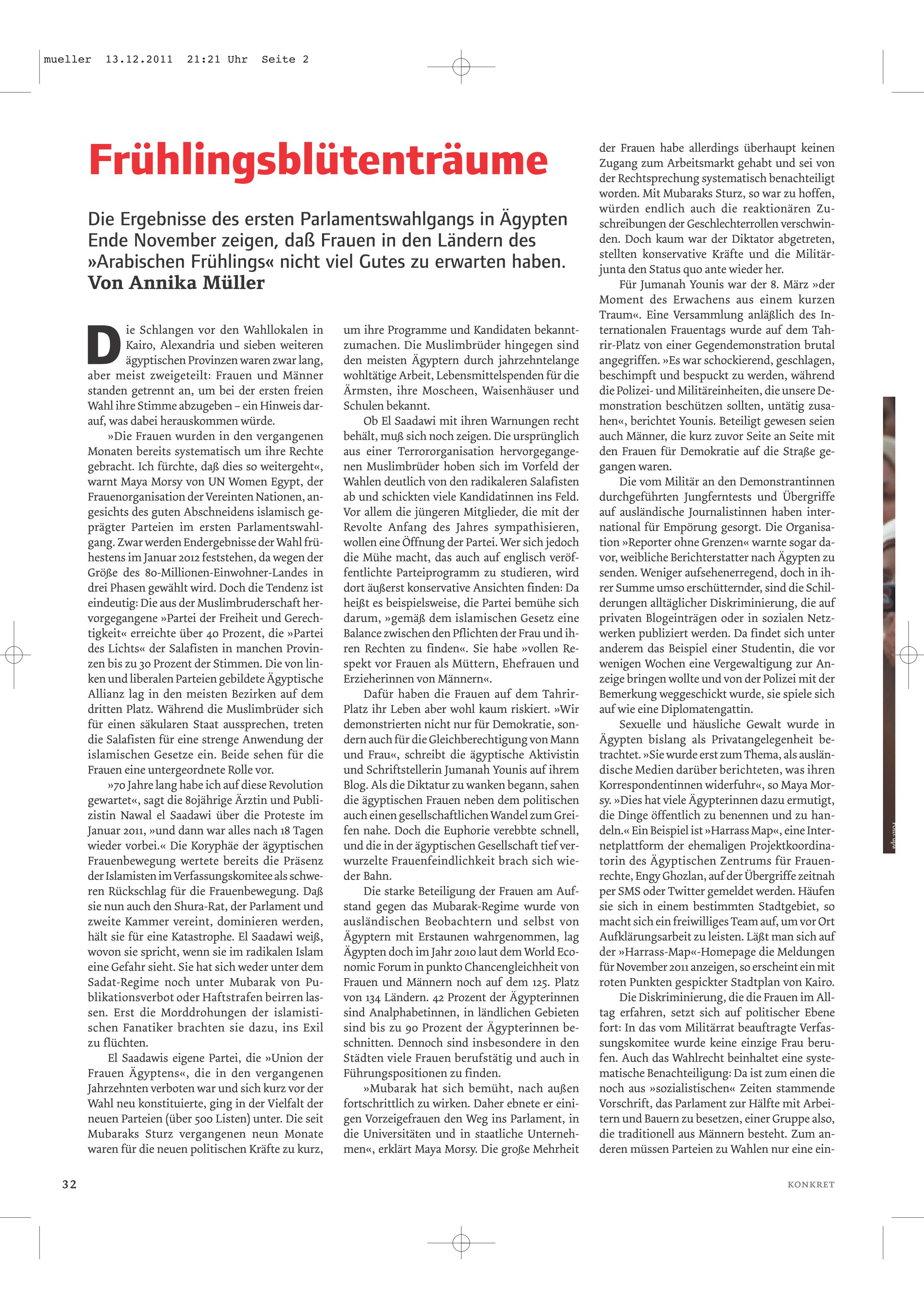 „Frühlingsblütenträume – Die ägyptischen Parlamentswahlen verheißen für die Lage der Frauen nichts Gutes“, erschienen in Konkret, Dezember 2011