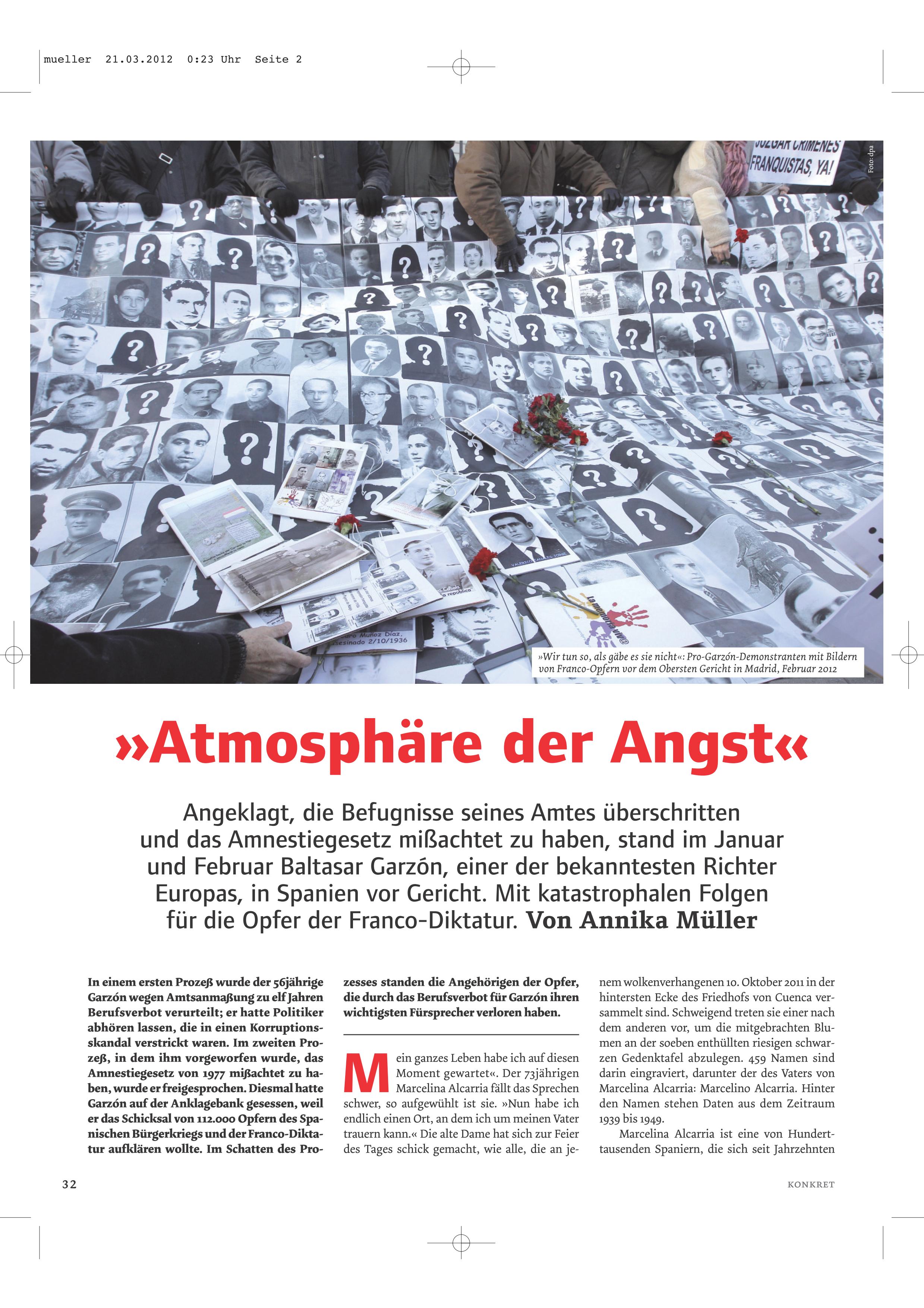 „Atmosphäre der Angst“, erschienen in Konkret 4, 2012