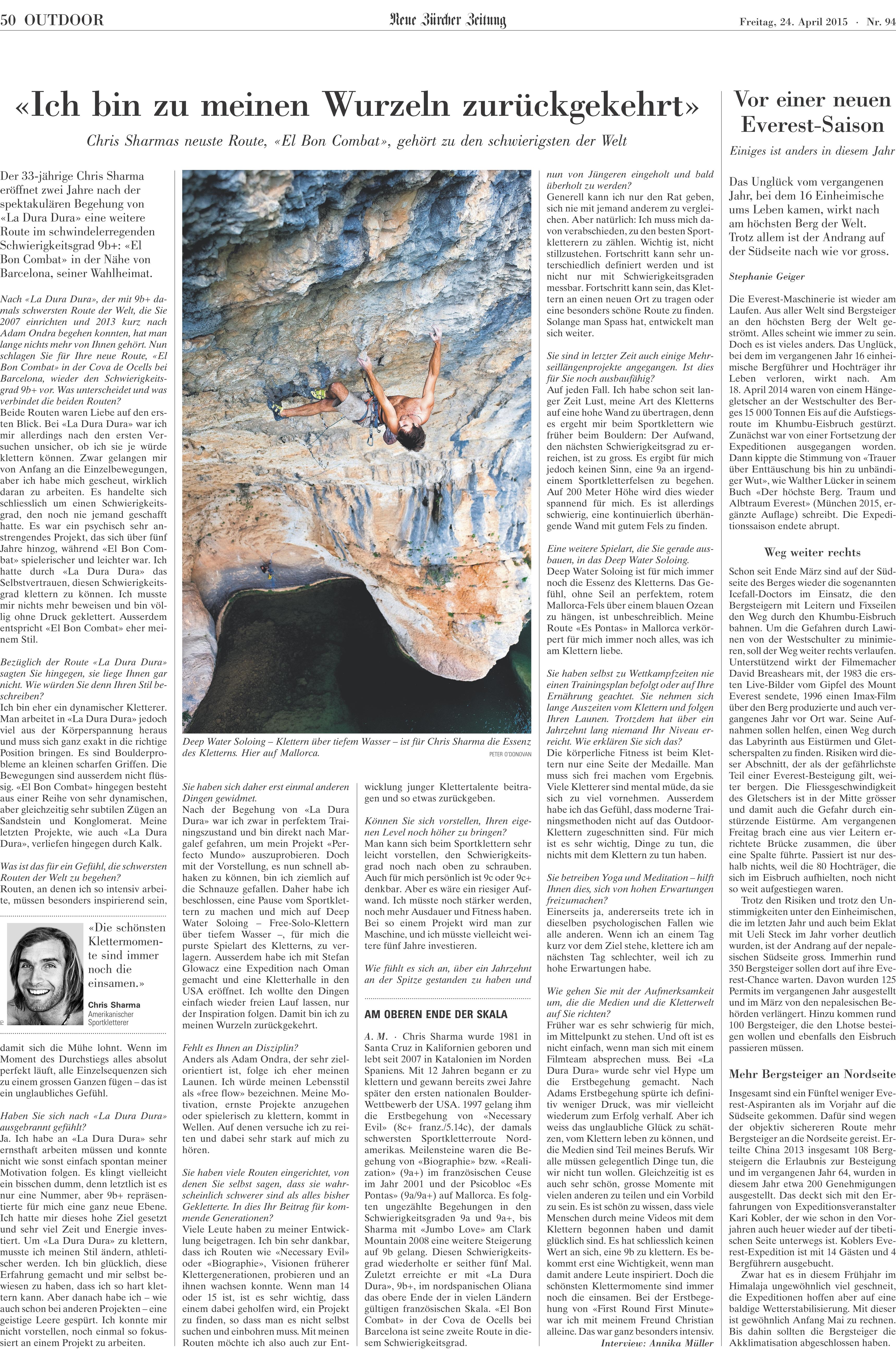 «Ich bin zu meinen Wurzeln zurückgekehrt» , Interview mit Chris Sharma, erschienen in NZZ 24.04.15 / Nr. 94