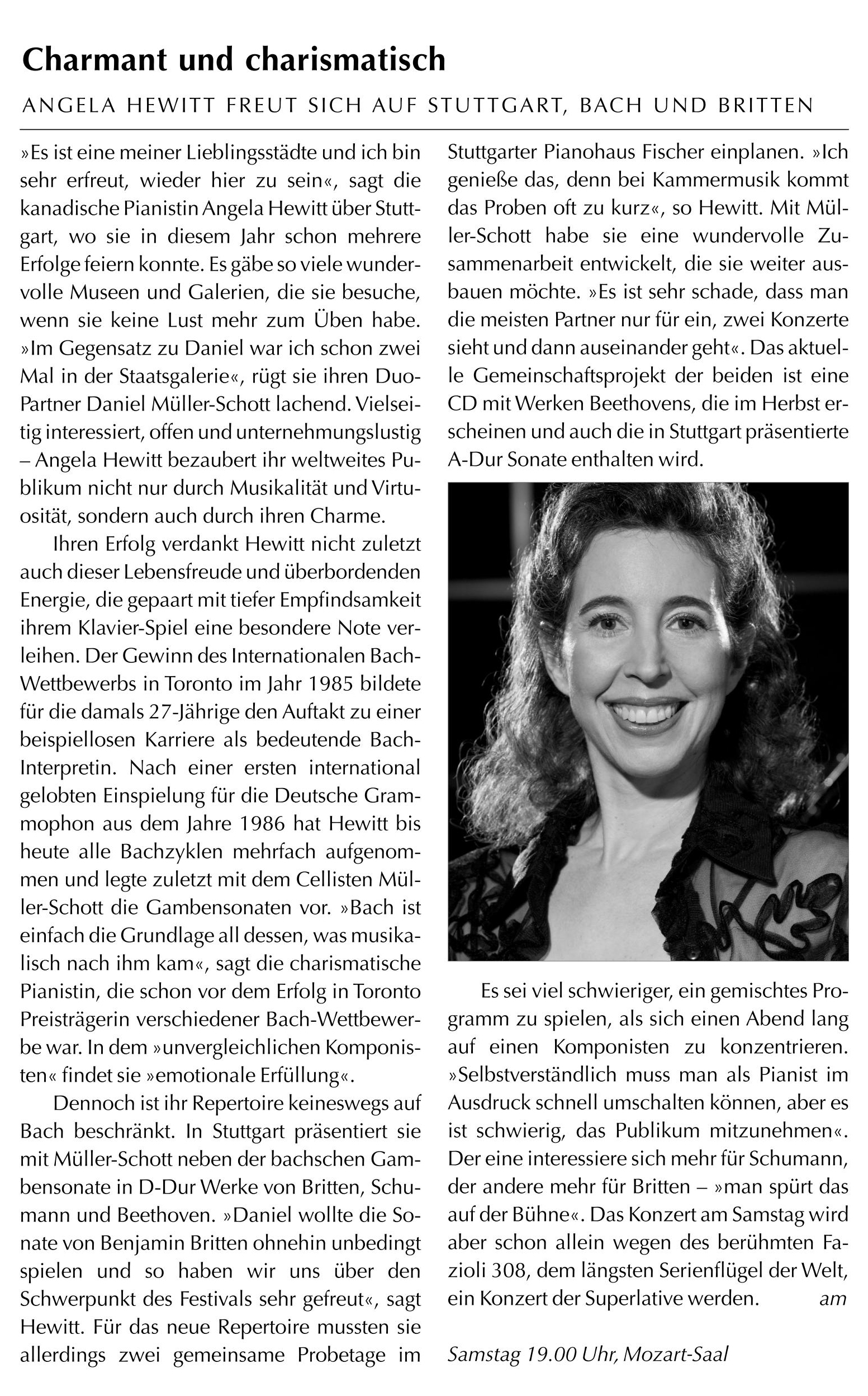 „Charmant und charismatisch“ – Die Pianistin Angela Hewitt freut sich auf Bach und Stuttgart, erschienen in MusikfestJournal Ausgabe 11, 7.9.2007