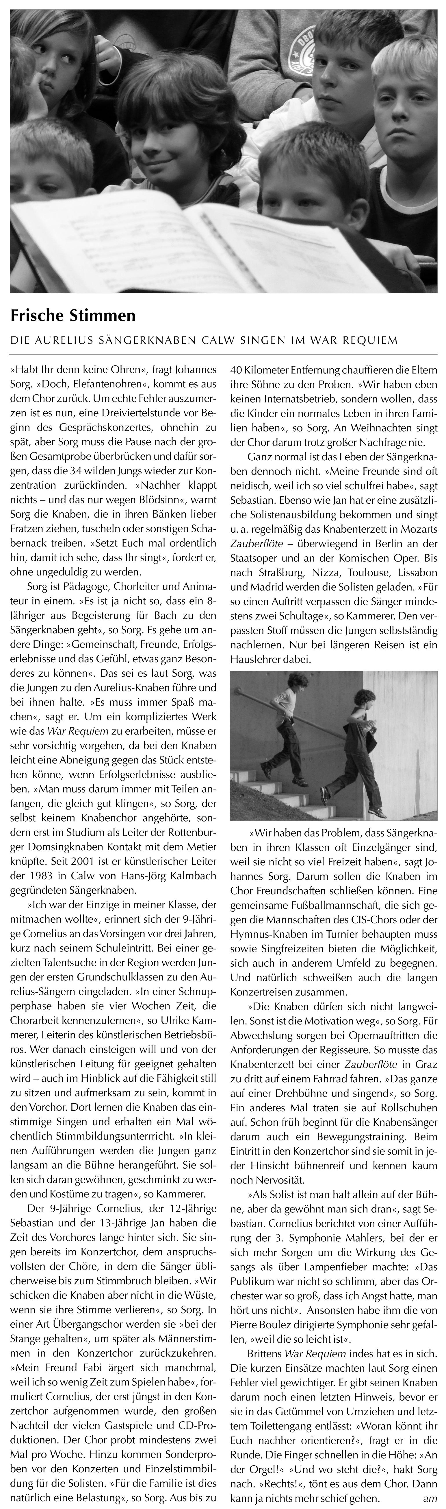 „Frische Stimmen“ – Die Aurelius Sängerknaben Calw singen in Brittens War Requiem, erschienen in MusikfestJournal Ausgabe 12, 8.9.2007