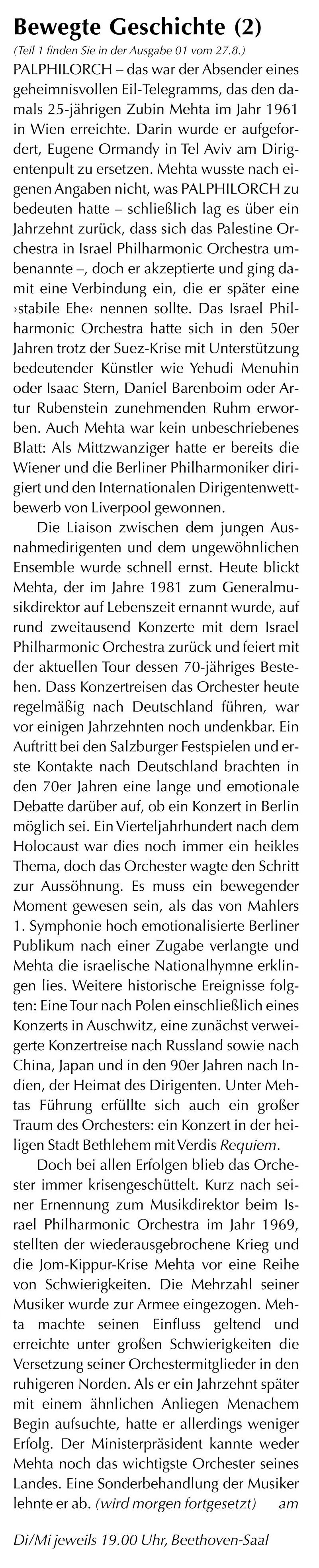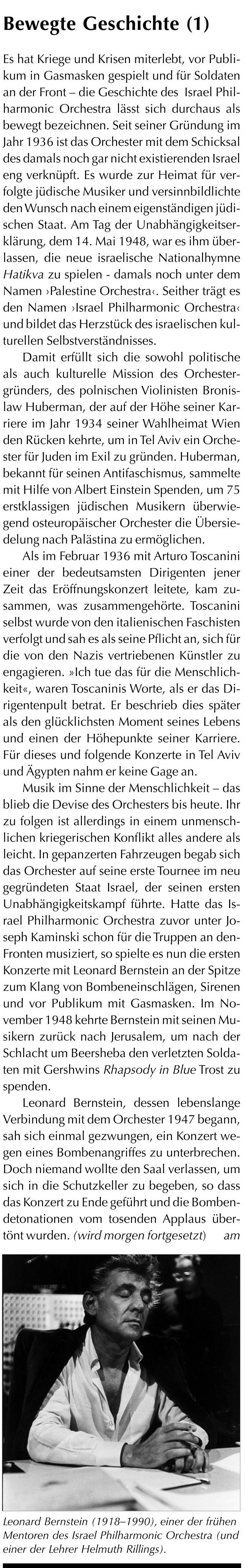 „Bewegte Geschichte 1- Das Israel Philharmonic Orchestra“, erschienen in MusikfestJournalAusgabe 1, 27.8.2007.