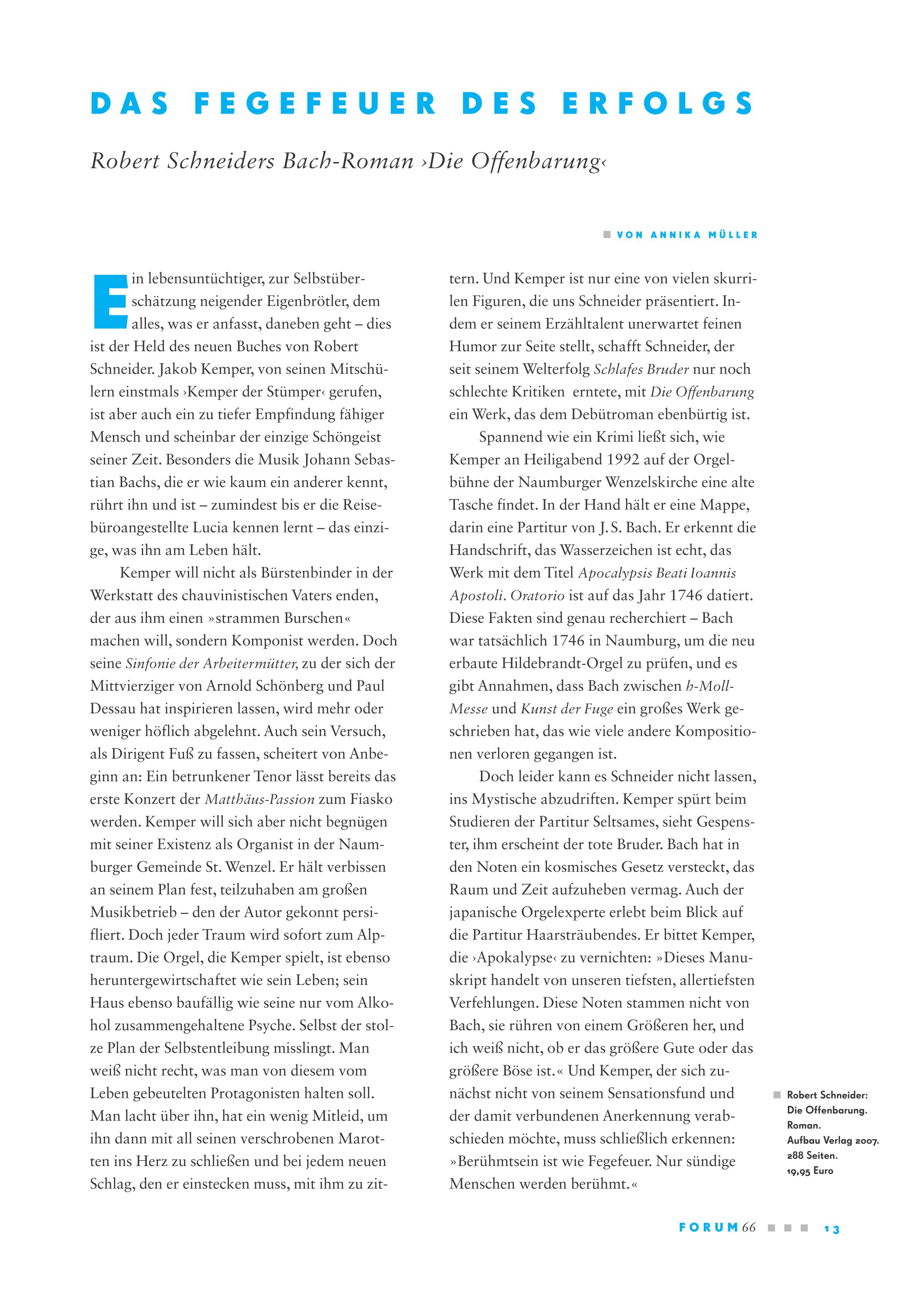 Buchkritik: „Das Fegefeuer des Erfolgs“- Robert Schneiders Bach-Roman „Die Offenbarung“, erschienen in Forum Bachakademie 66, 2008. Forum66 als PDF-Download:forum66