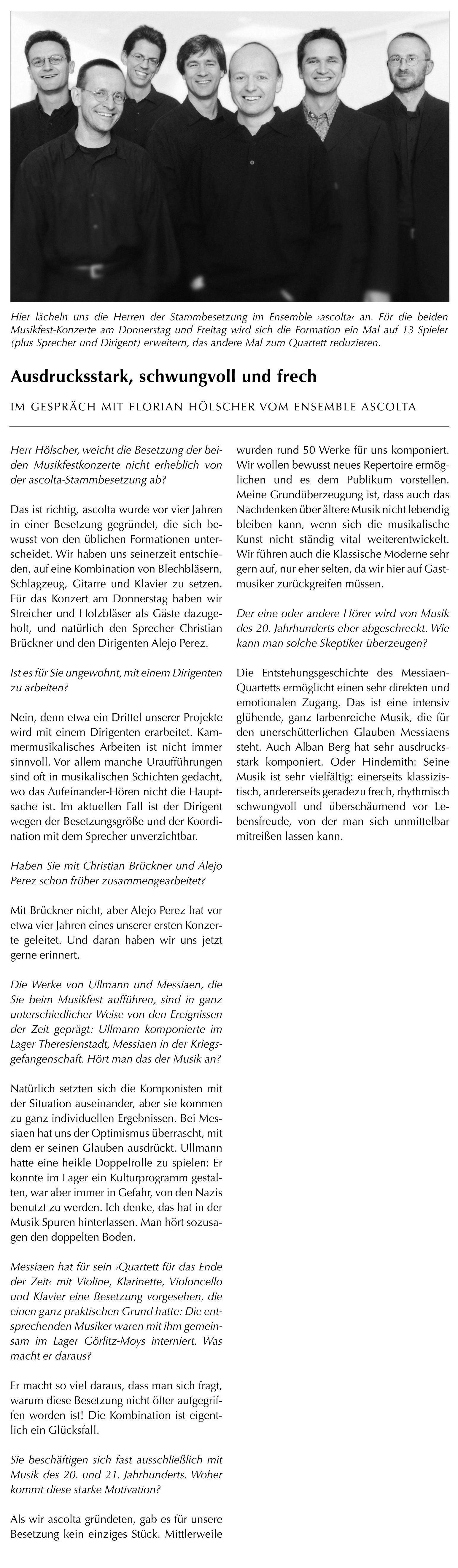 „Ausdrucksstark, schwungvoll, frech“ – Interview mit dem Ensemble Ascolta, erschienen in MusikfestJournal Ausgabe 3, 29.8.2007