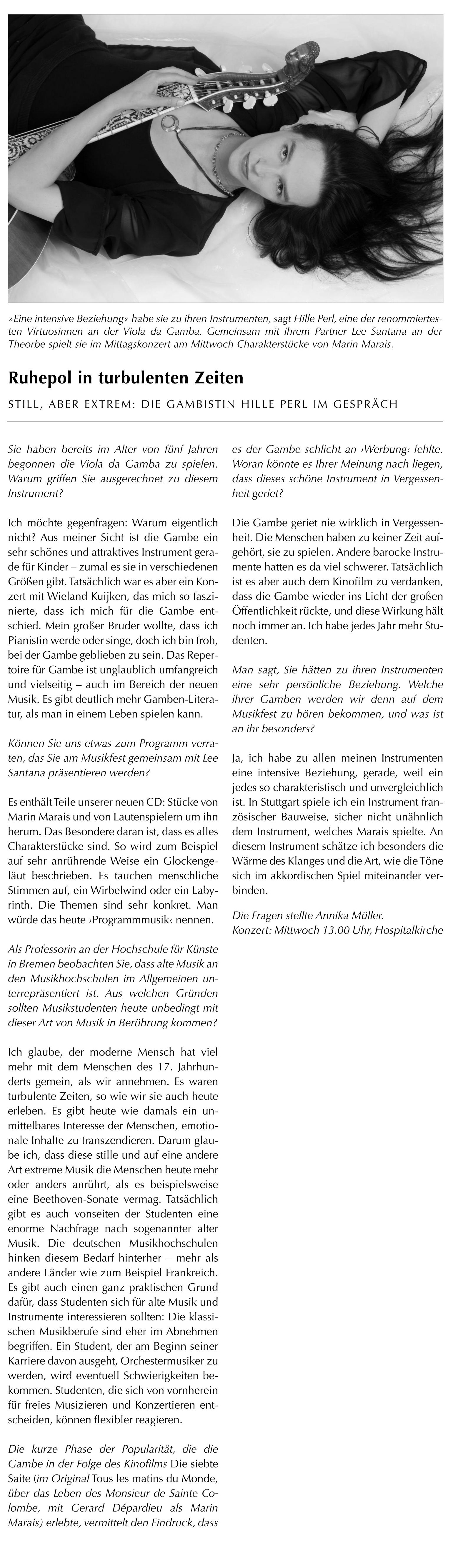 „Ein Ruhepol in stürmischen Zeiten – Gambistin Hille Perl im Gespräch“ erschienen in MusikfestJournal Ausgabe 2, 28.8.2007