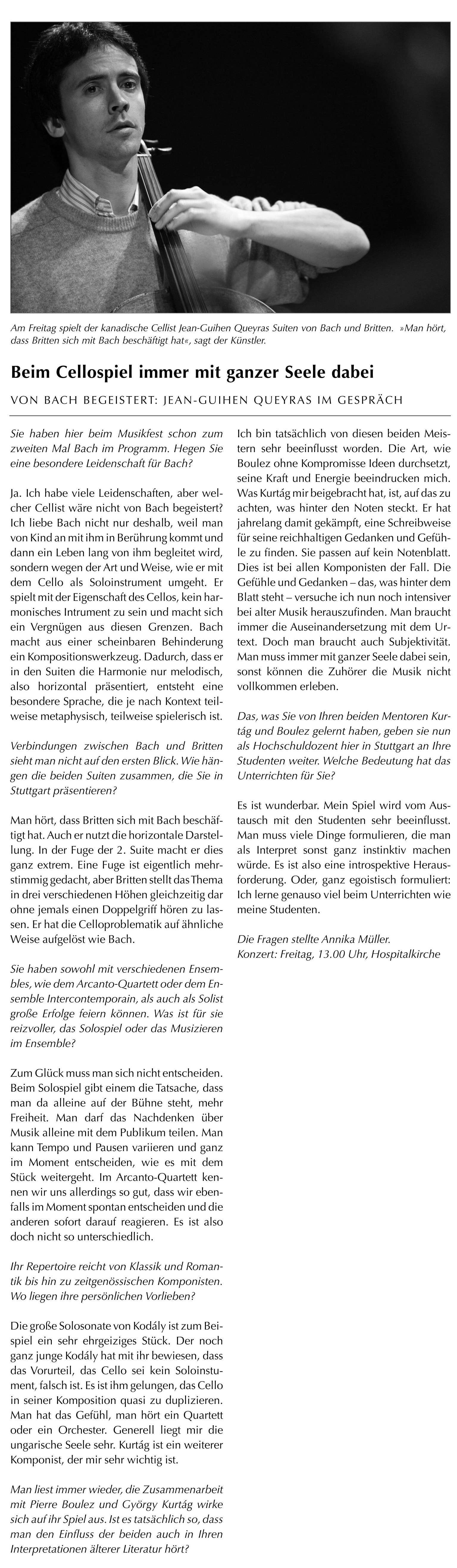 „Beim Cellospiel immer mit ganzer Seele dabei“ – Von Bach begeistert: Jean-Guihen Queyras im Gespräch, erschienen in MusikfestJournal Ausgabe 10, 6.9.2007