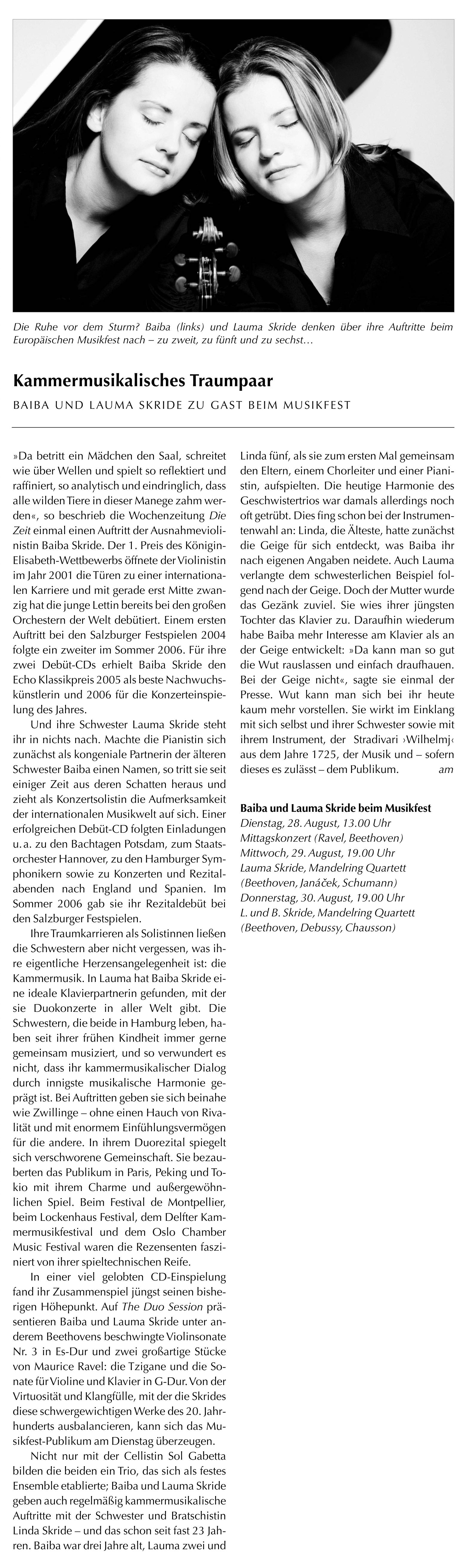 „Kammermusikalisches Traumpaar – Baiba und Lauma Skride“, erschienen in MusikfestJournal Ausgabe 1, 27.8.2007.