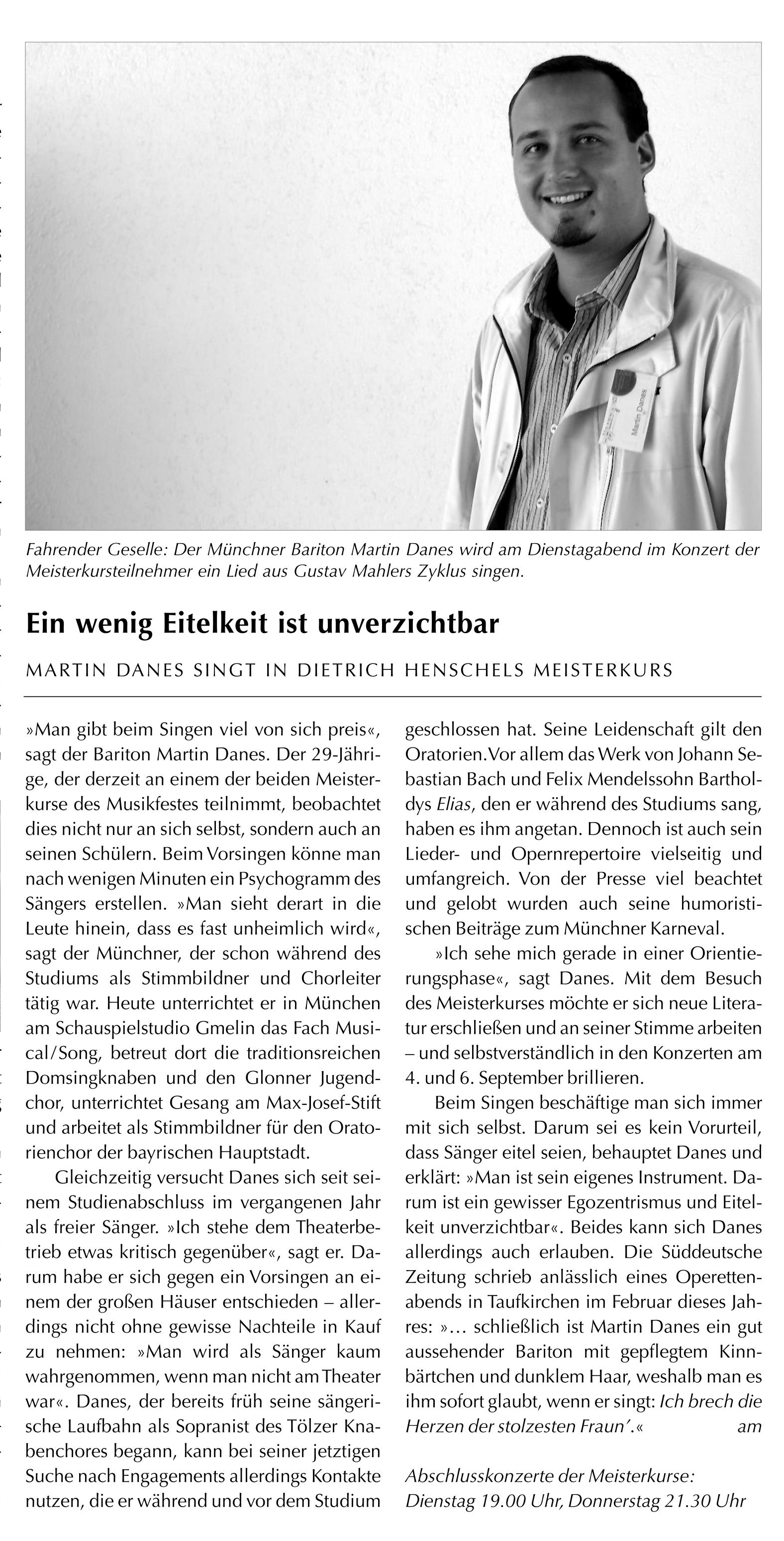 „Ein wenig Eitelkeit ist unverzichtbar“ – Der Tenor Martin Danes, erschienen in MusikfestJournal Ausgabe 8, 5.9.2007