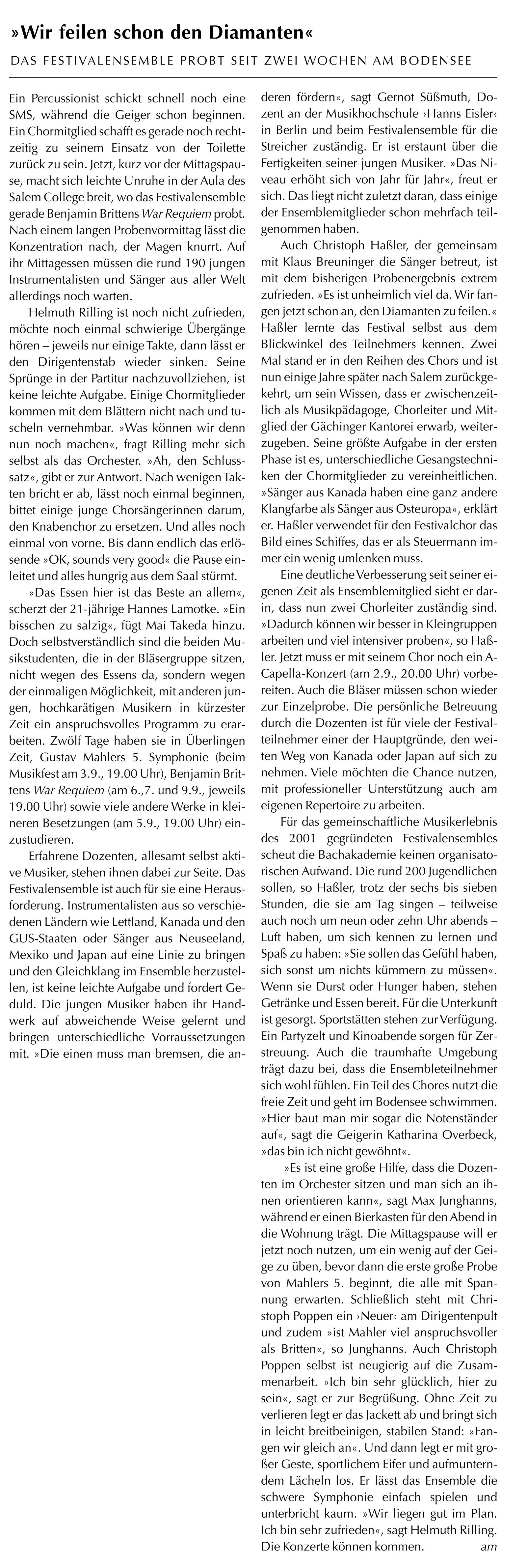 „Probenreportage Festivalensemble“, erschienen in MusikfestJournal Ausgabe 3, 29.8.2007