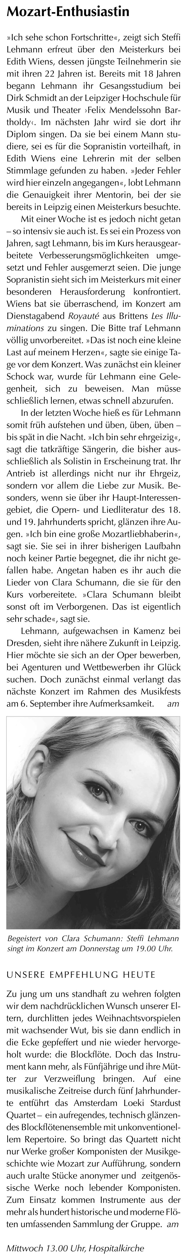 „Mozart-Enthusiastin“ – Die Sopranistin Steffi Lehmann, erschienen in MusikfestJournal Ausgabe 10, 6.9.2007