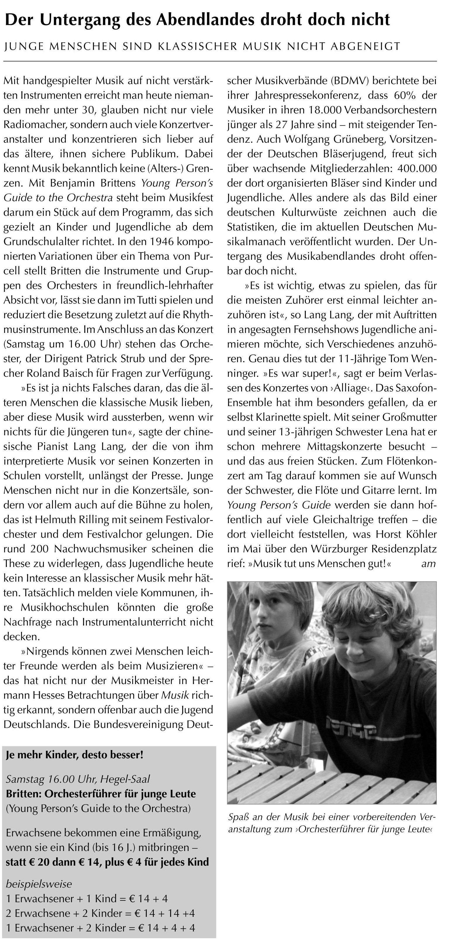„Der Untergang des Abendlandes droht doch nicht“ – junge Menschen sind klassischer Musik nicht abgeneigt, erschienen in MusikfestJournal Ausgabe 10, 6.9.2007