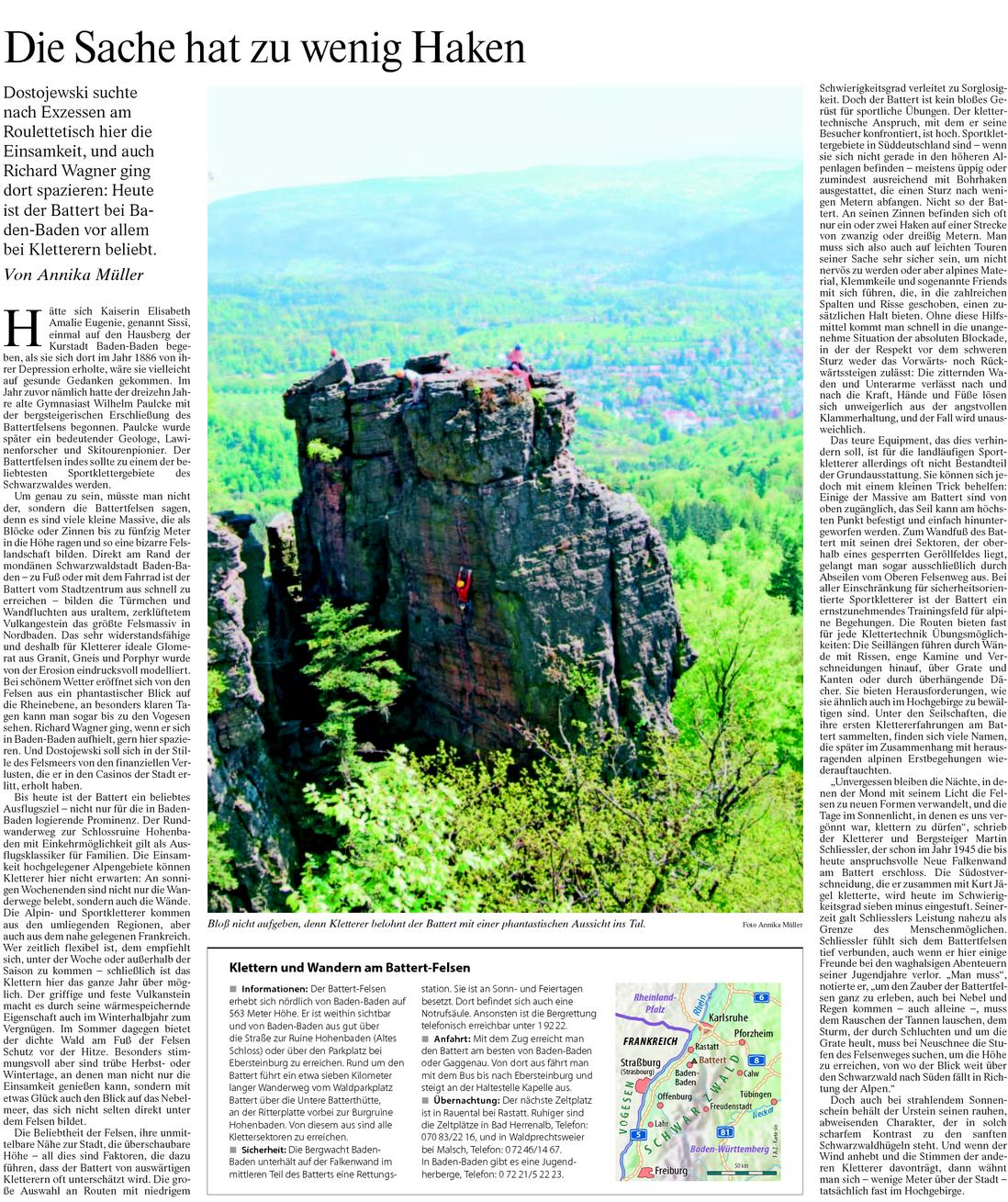 Reise: Klettern am Battert „Die Sache hat zu wenig Haken“,erschienen in FAZ Reisejournal am 12. Juni 2008, Artikel als PDF-Download: FAZ Reise Klettern am battert 12.6.2008