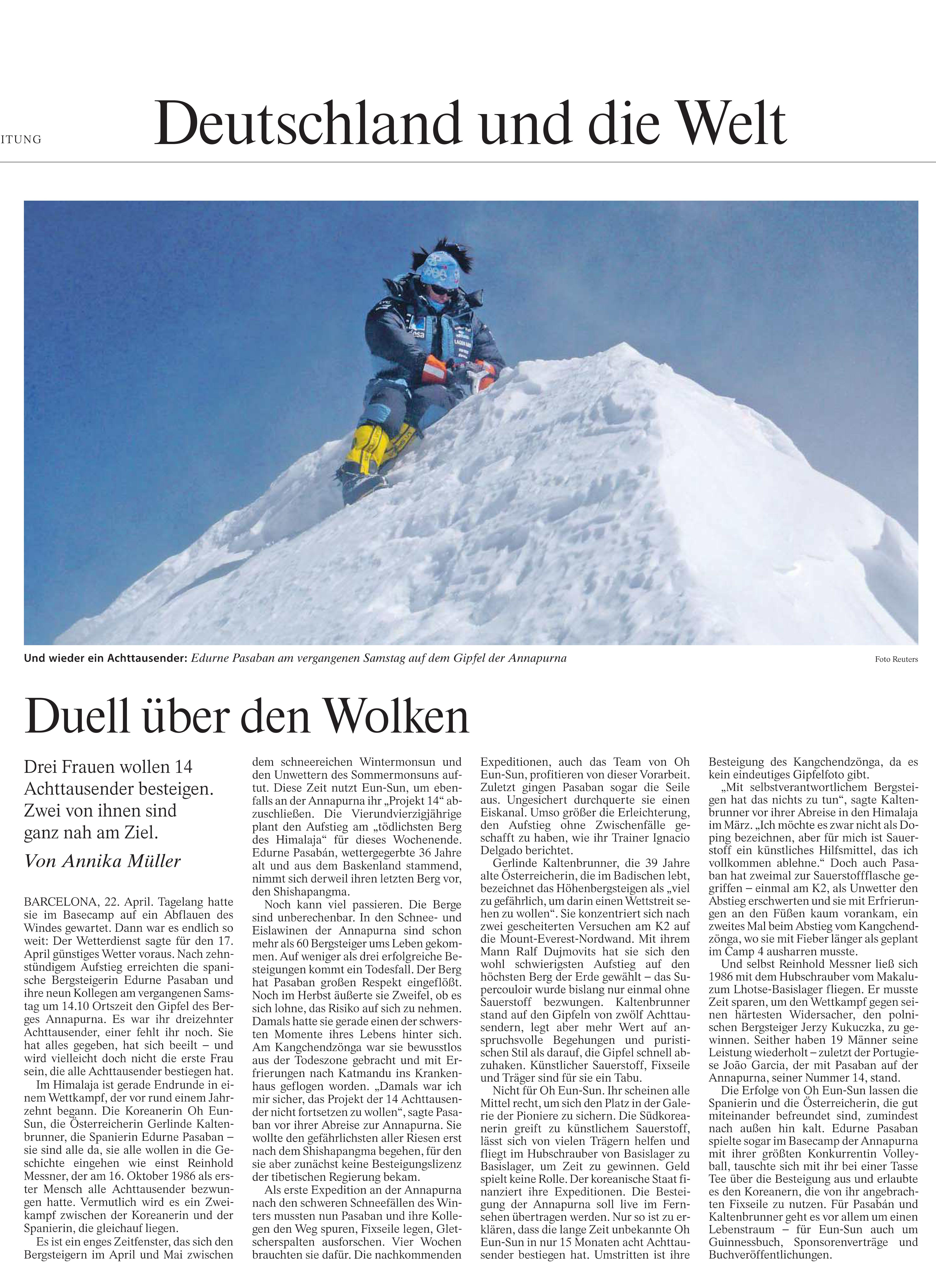 Alpinismus: Duell über den Wolken, erschienen in FAZ, Deutschland und die Welt, am 23.4.2010 Artikel als PDF-Download: FAZ DuW Duell über den Wolken