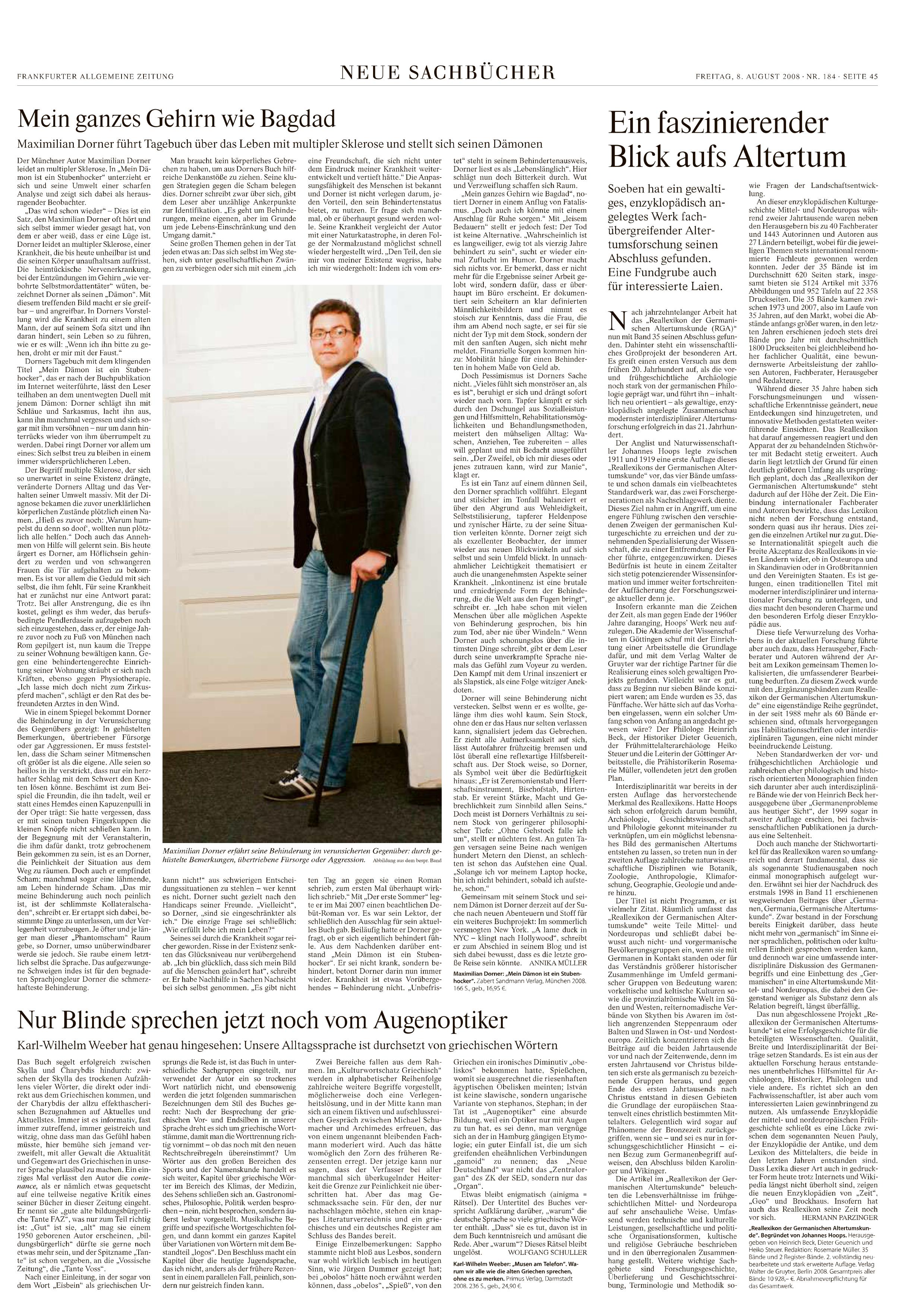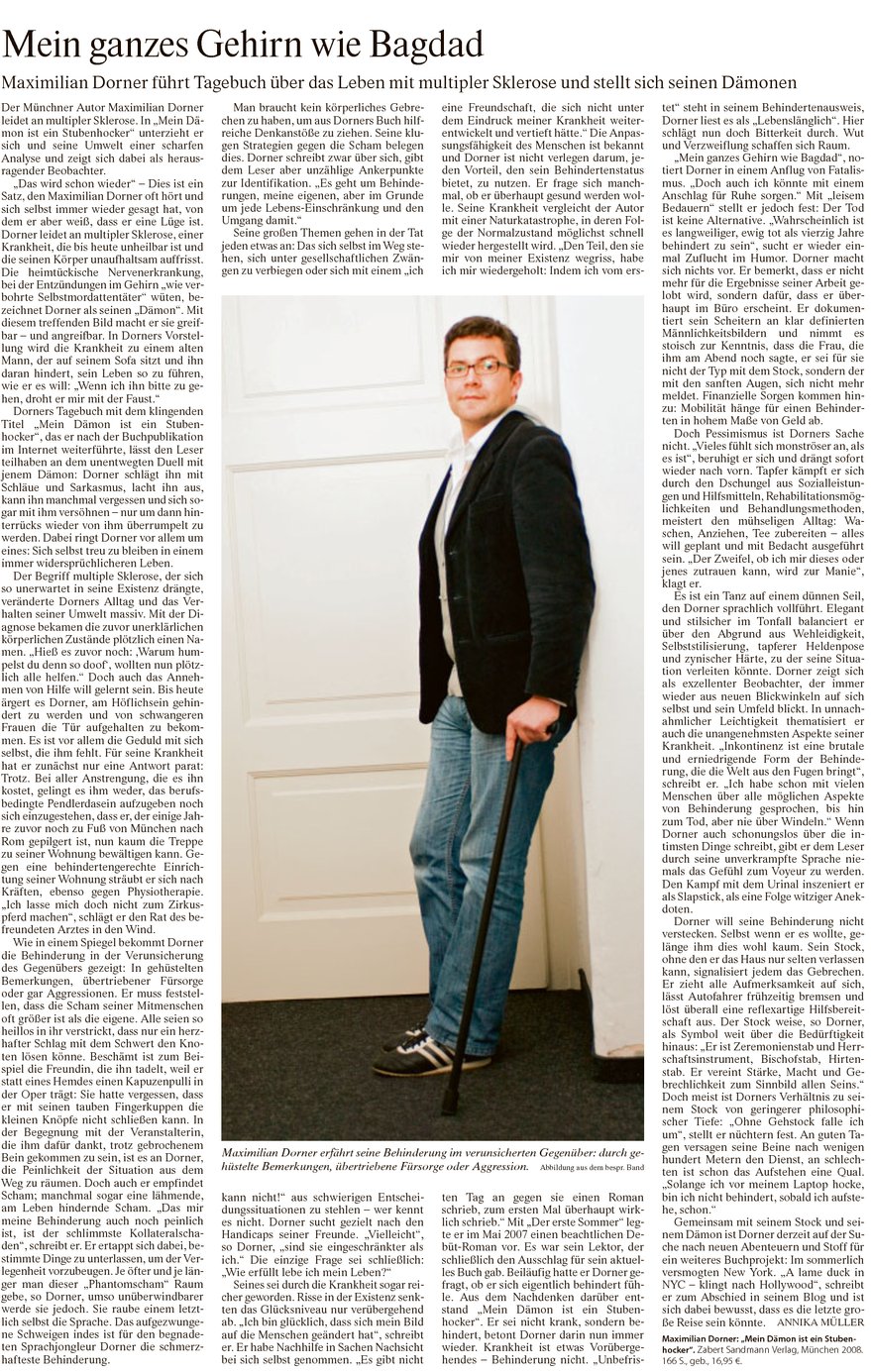 Sachbuchkritik Maximilian Dorner: Mein Dämon ist ein Stubenhocker, erschienen in FAZ Feuilleton am 8.8 2008. Artikel als PDF-Download: FAZ Maximilian Dorner 8.8.2008