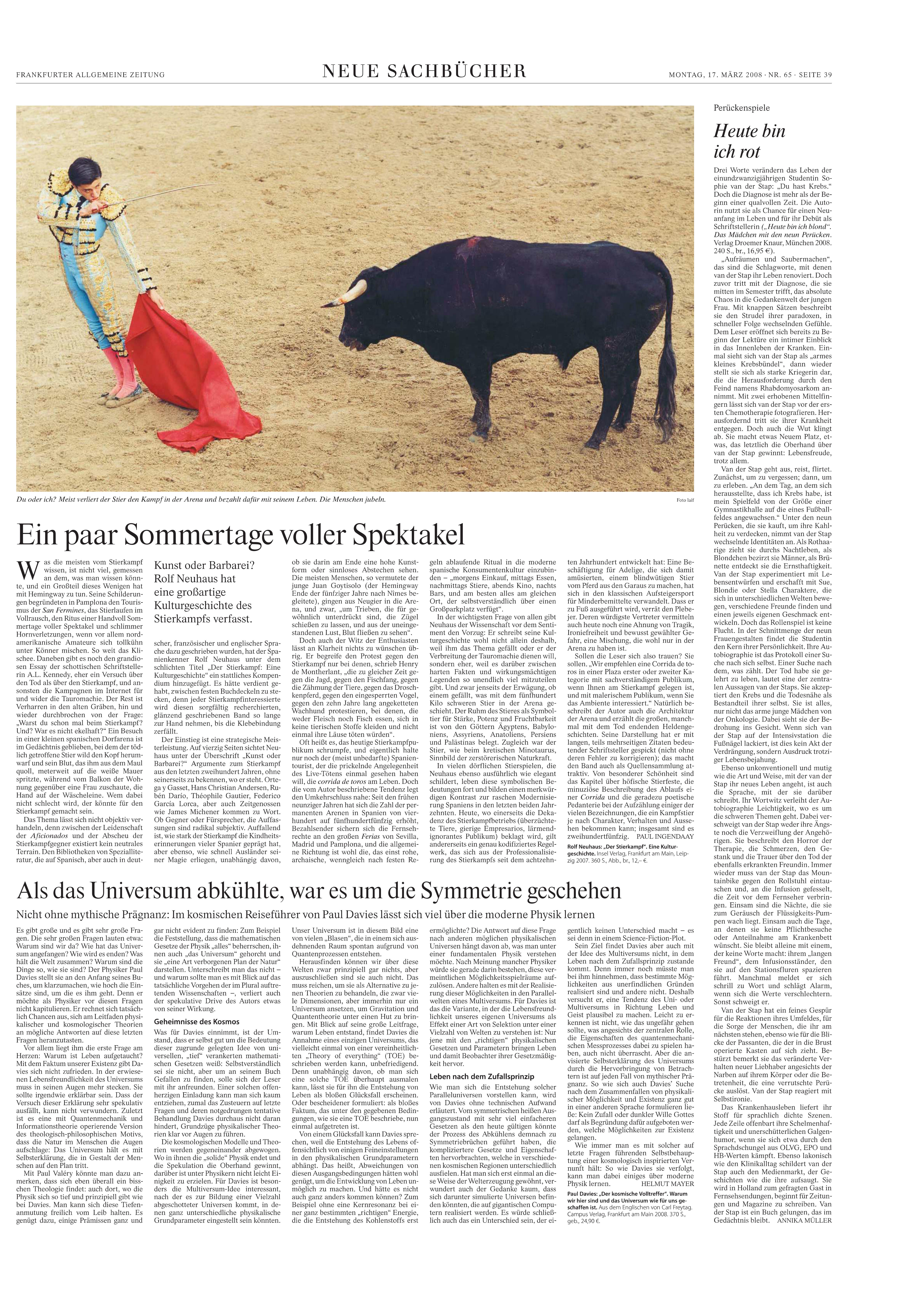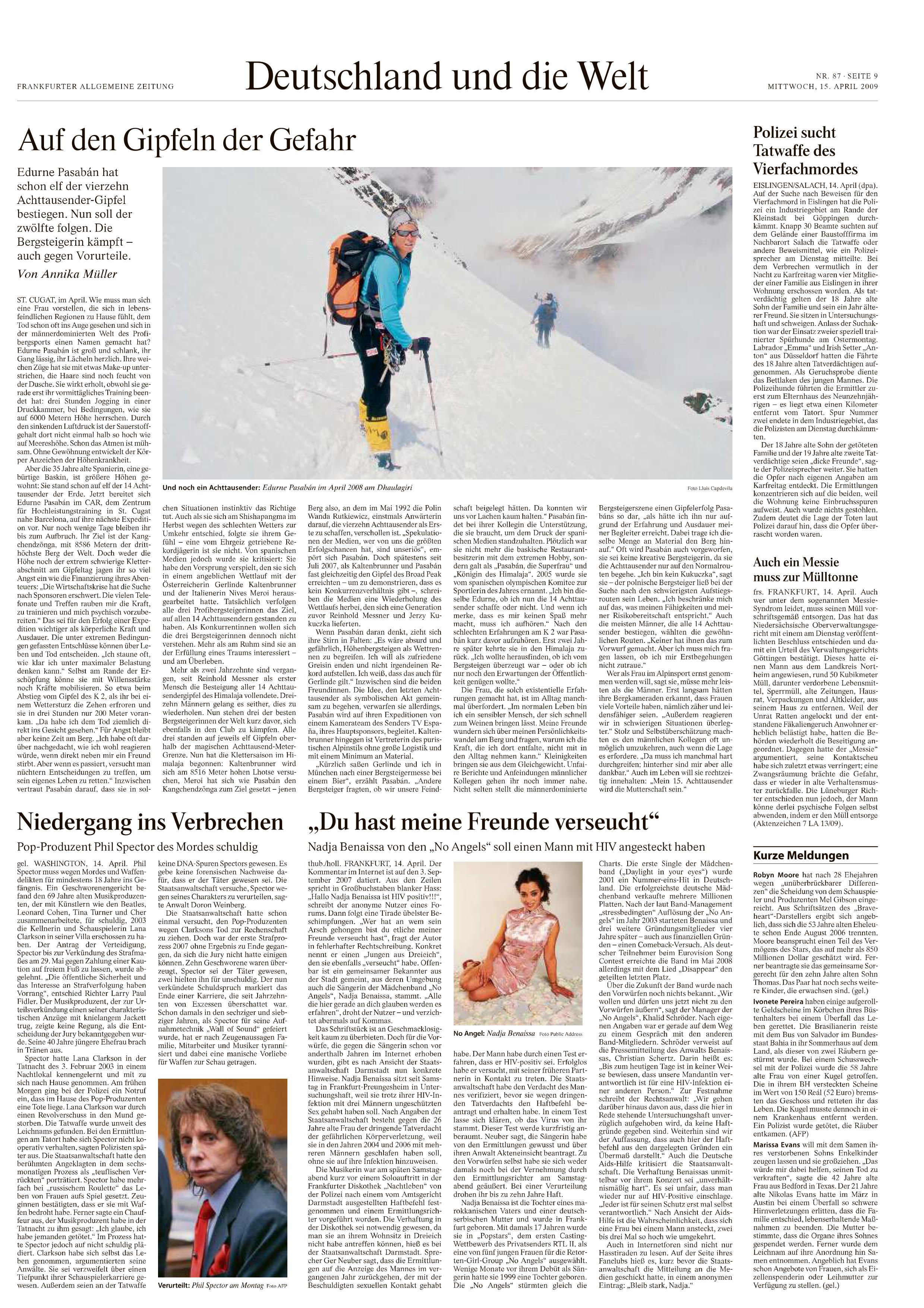 Alpinimus: Auf den Gipfeln der Gefahr, erschienen in FAZ, Deutschland und die Welt, 15. April 2009, Artikel als PDF-Download:FAZ DuW Auf den Gipfeln der Gefahr 15.4.2009