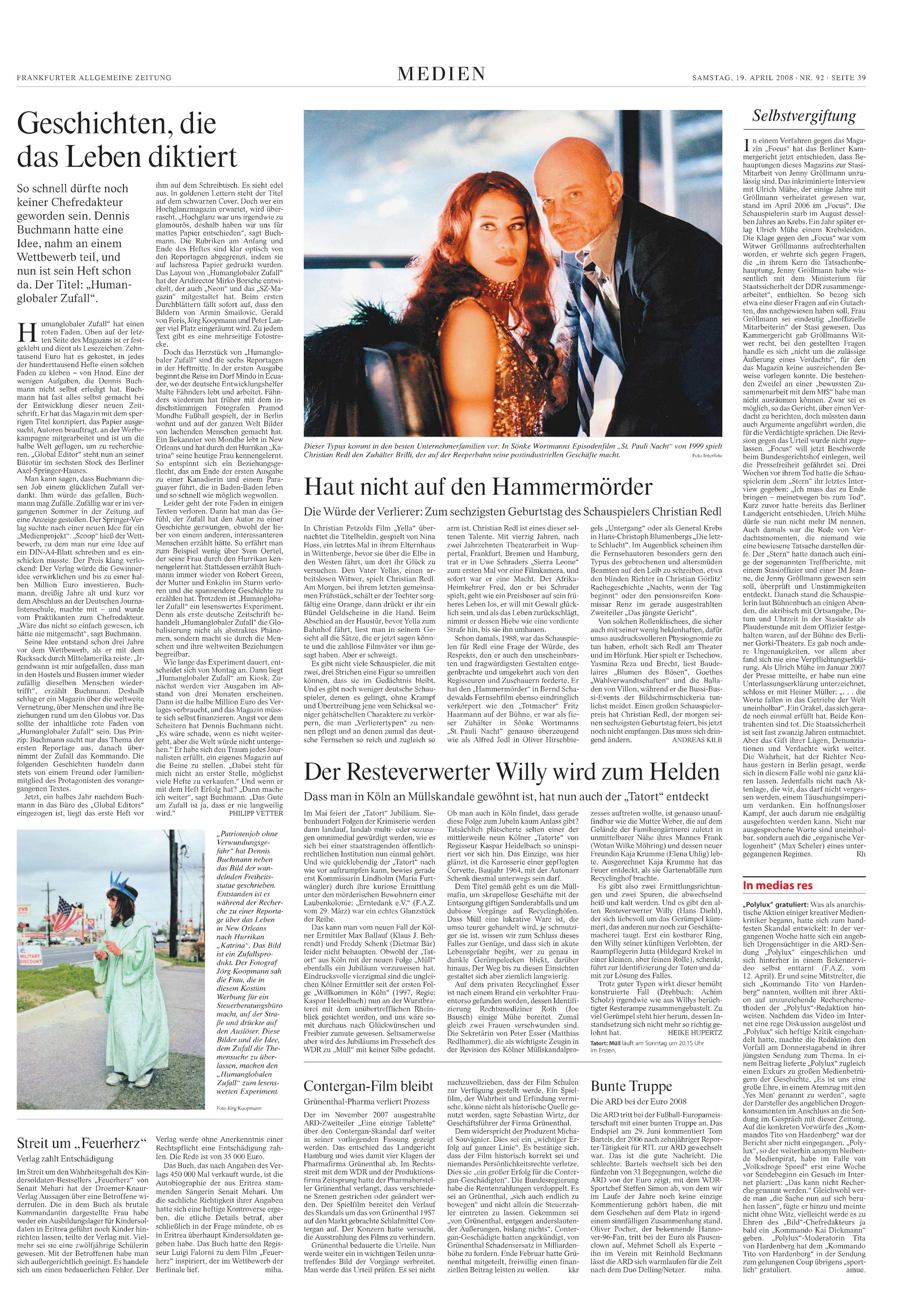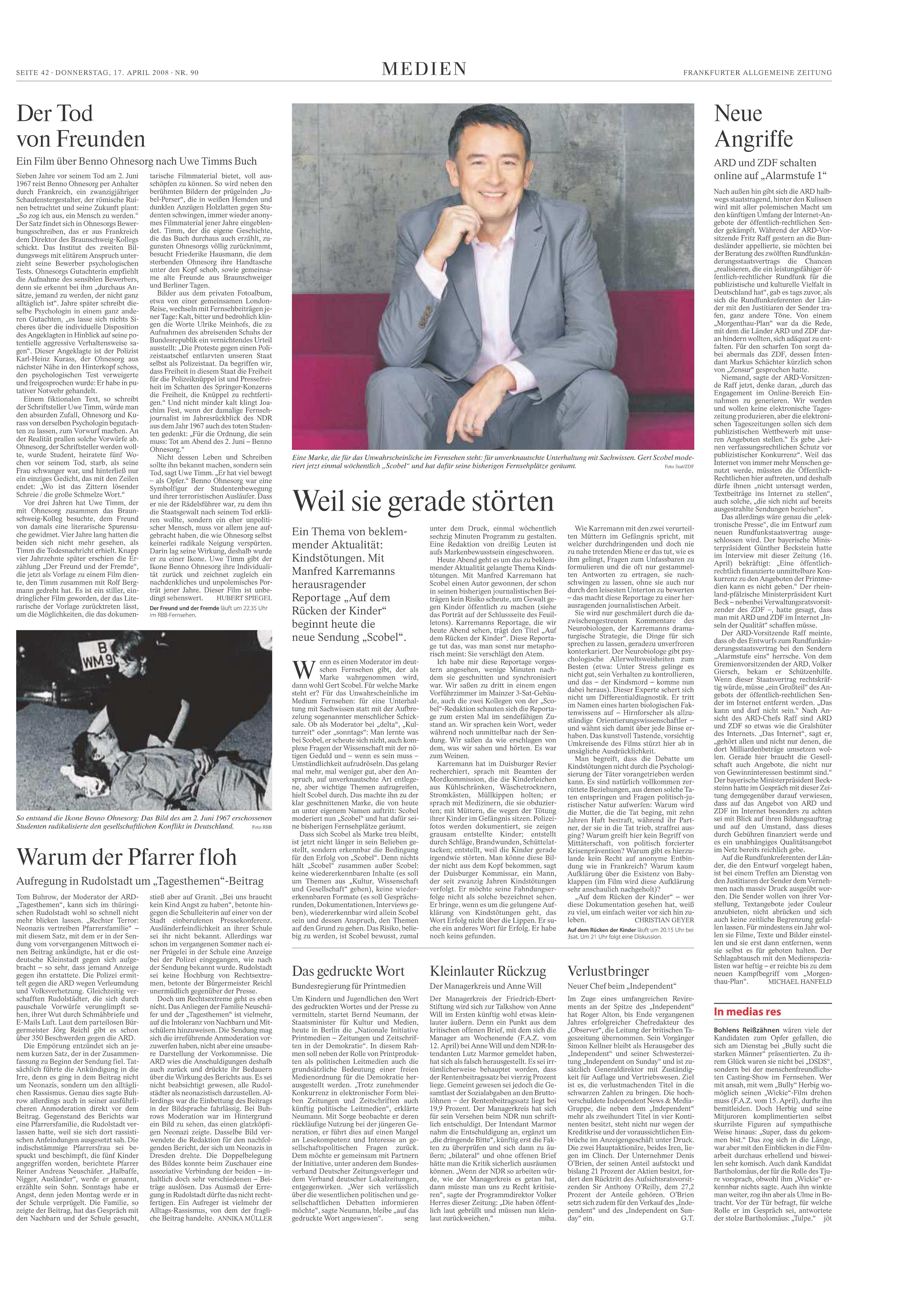 Medienkritik „Warum der Pfarrer floh“ erschienen in FAZ, Feuilleton/Medien 17.4.2008: Artikel als PDF-Download FAZ Pfarrer Tagesthemen 17.4.2008