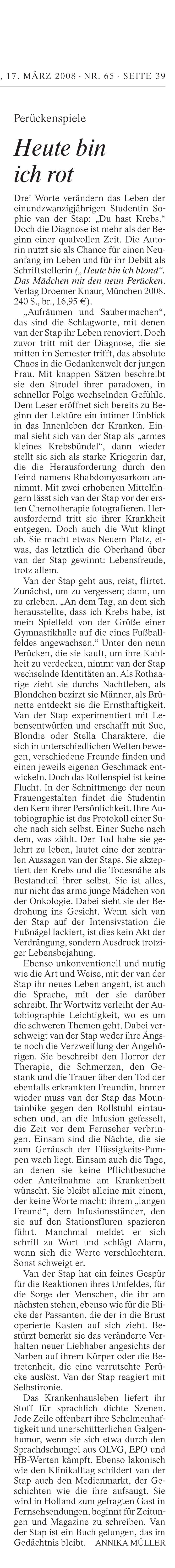 Sachbuchkritik Sophie van der Stab: Heute bin ich blond, erschienen in FAZ, Feuilleton 17.3.2008: Artikel als PDF-Download:FAZ Kritik Sophie van der Stab 17.3.2008