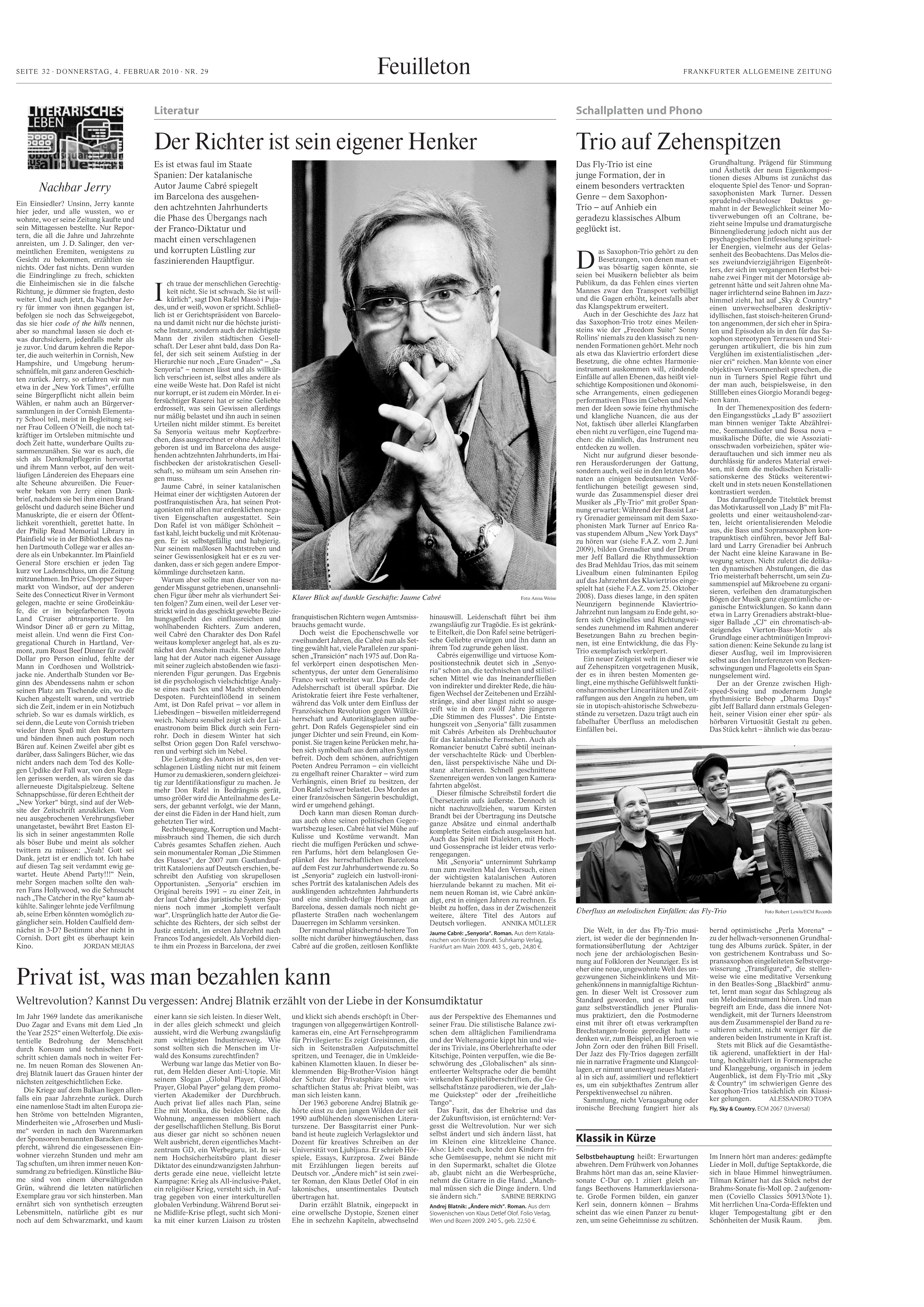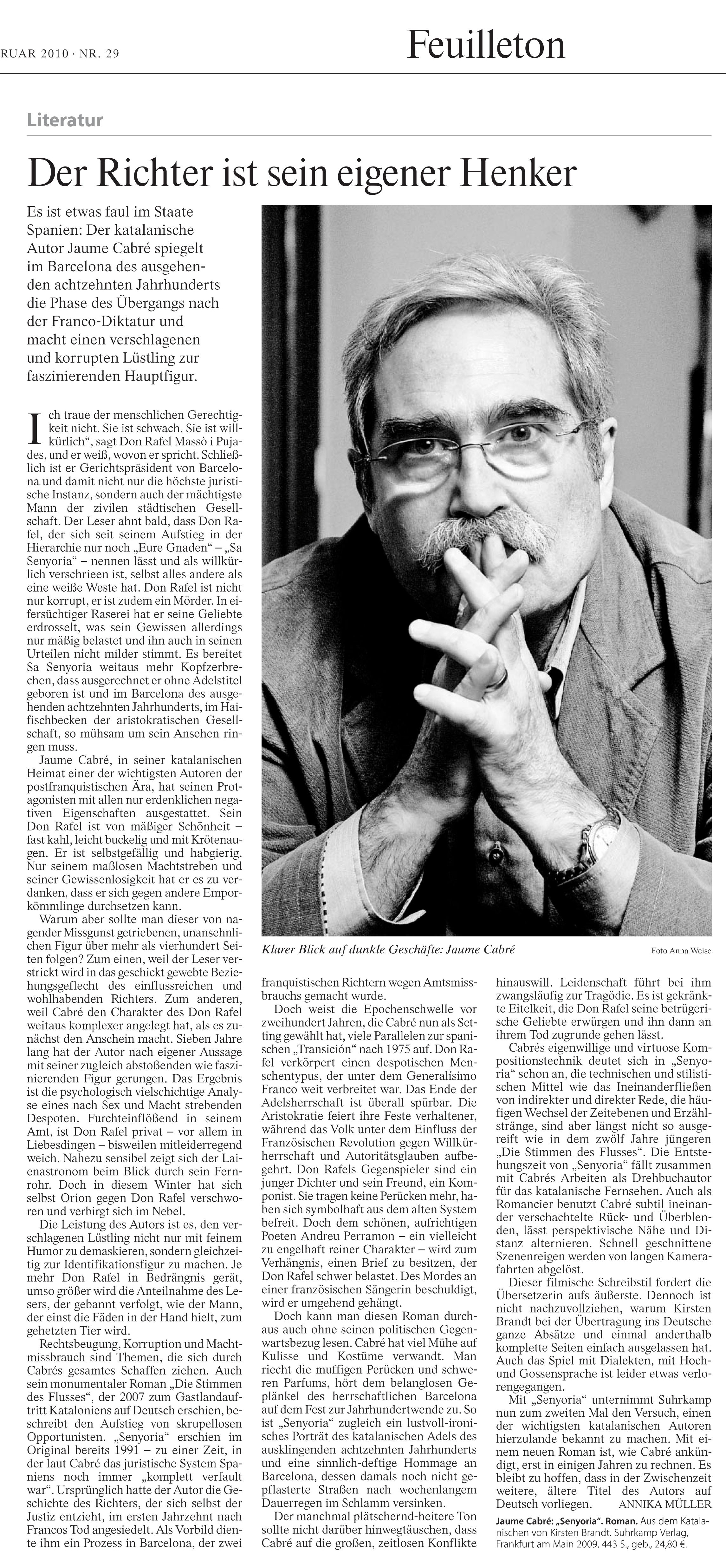 Literaturkritik Jaume Cabré: Senyoria, erschienen im FAZ Feuilleton am 4.2.2010 Artikel als PDF-Download: FAZ LIT Jaume Cabré Senyoria 4.2.2010,FAZ LIT Senyoria Faksimile