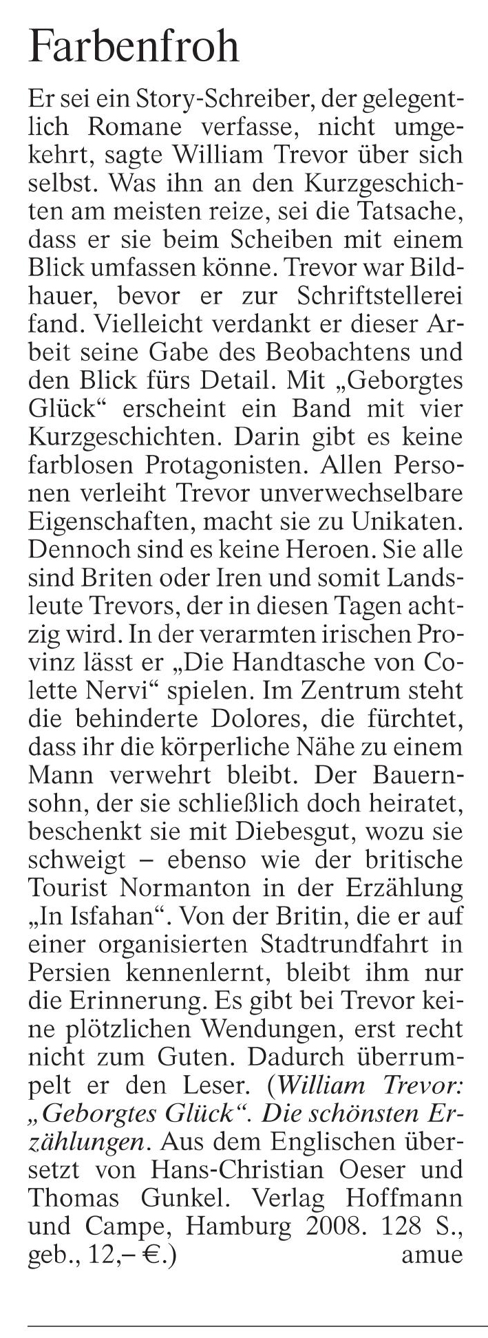 Literaturkritik William Trevor, erschienen in FAZ Feuilleton am 9.5.2008