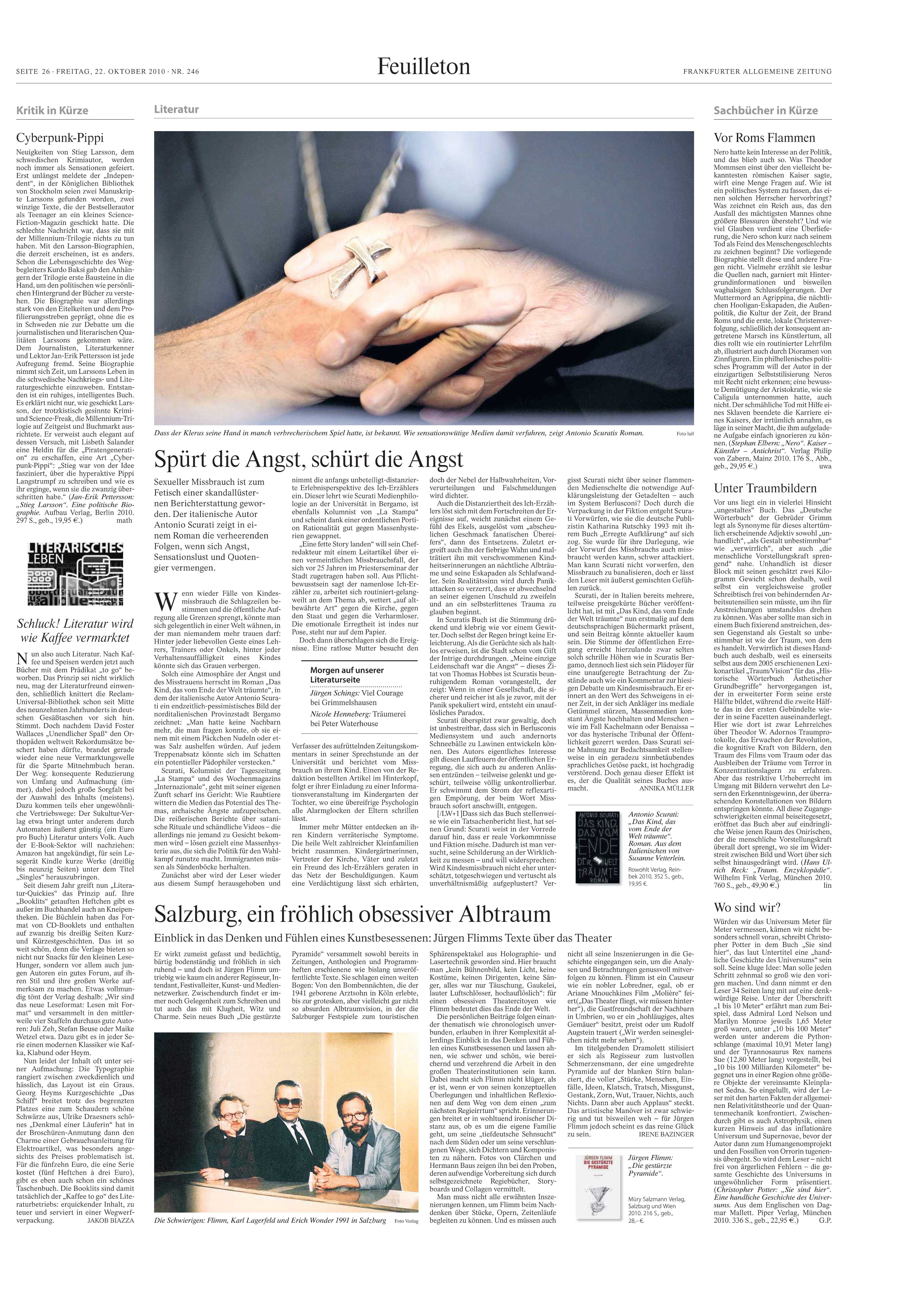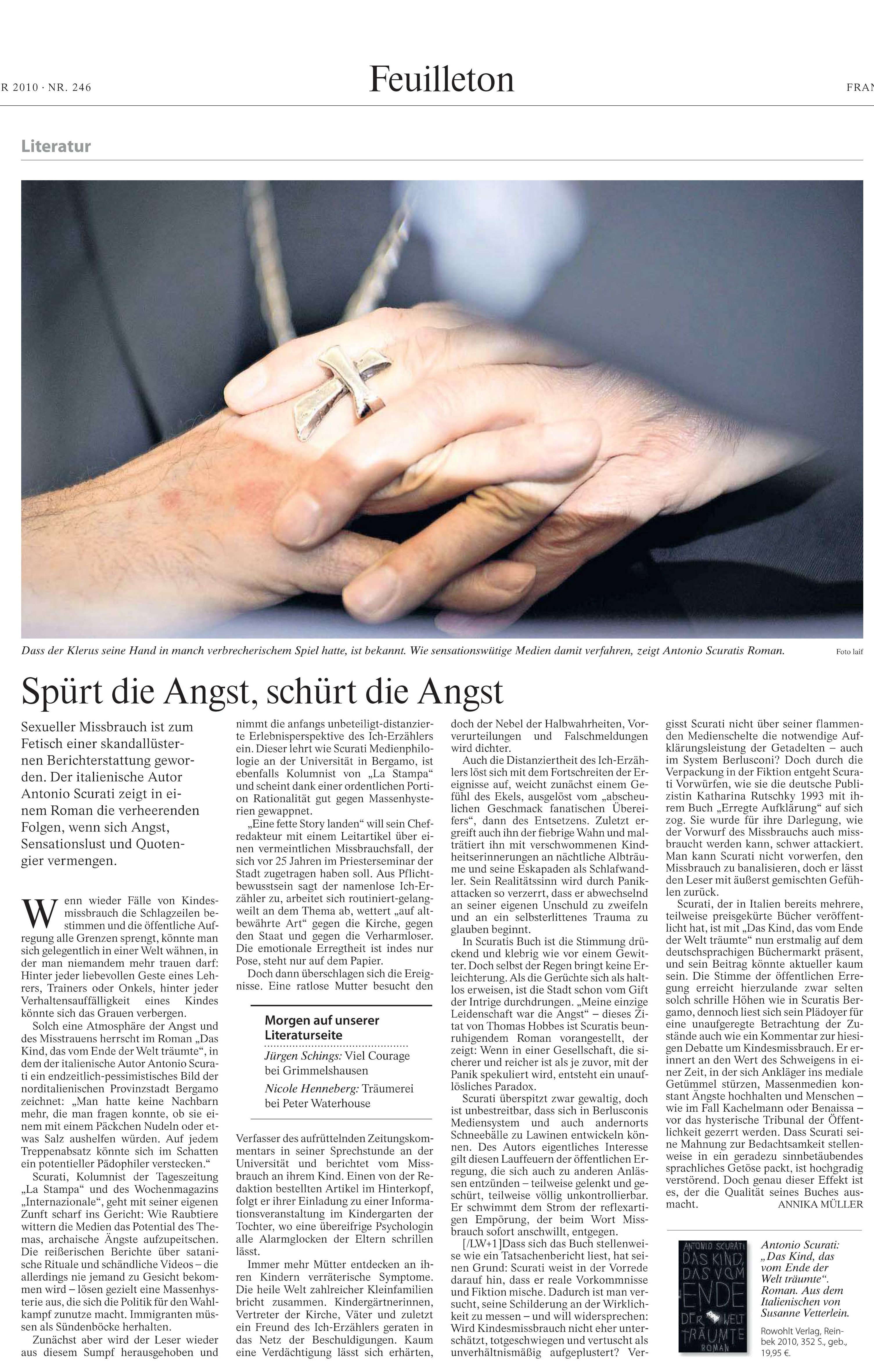 Literaturkritik Antonio Scurati: Das Kind, das vom Ende der Welt träumt, erschienen im FAZ Feuilleton am 22.10.2010 Artikel als PDF-Download:FAZ Antonio Scurati 22.10.2010