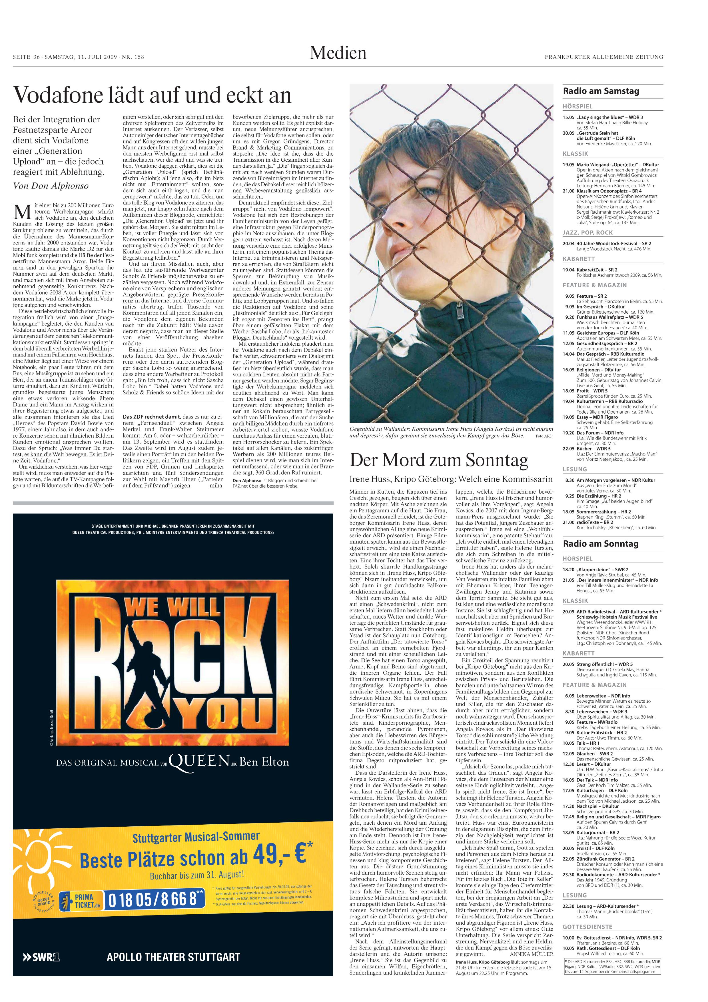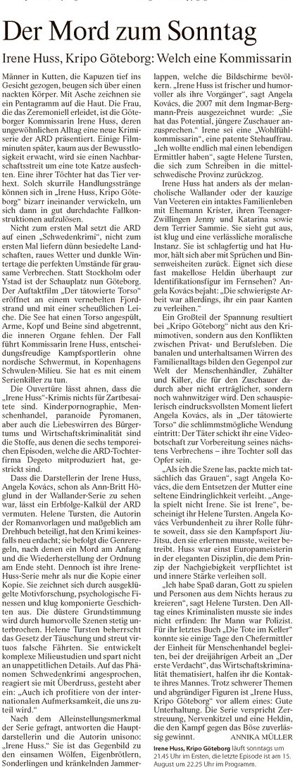 Fernsehkritik Irene Huss, Kripo Göteburg, erschienen im FAZ Feuilleton, Medien, 11.7.2009. Artikel als PDF-Download:FAZ Medien Irene Huss Juli 2009