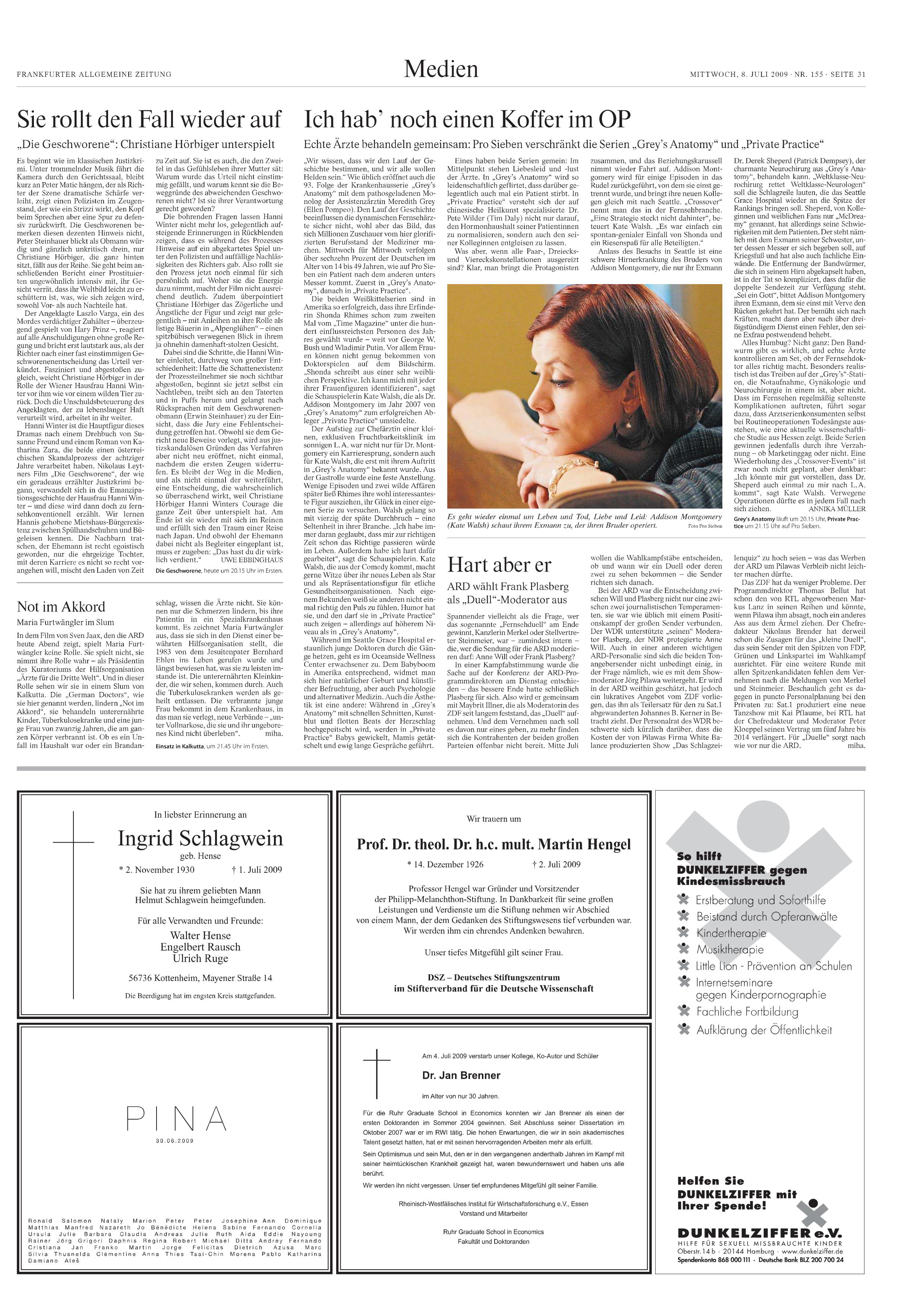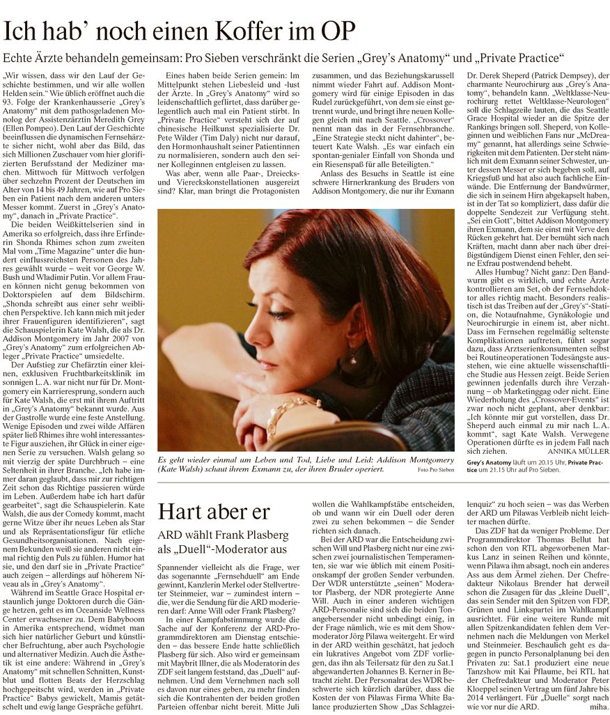 Fernsehkritik Grey’s Atonomy und Private Practice, erschienen im FAZ Feuilleton, Medien, 8.7.2009. Artikel als PDF-Download:FAZ Medien Kate Walsh 8.7.2009
