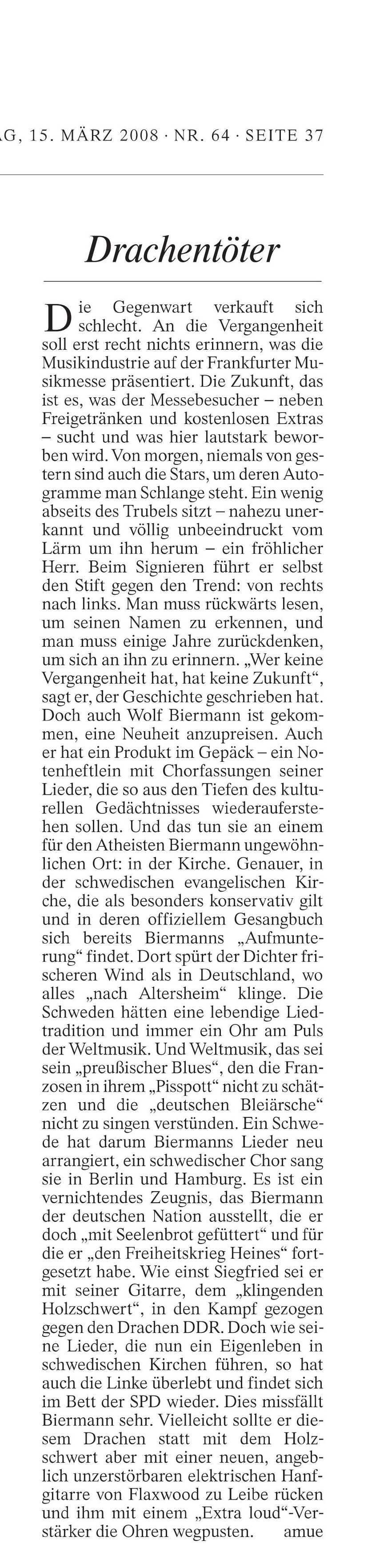 Glosse: „Drachentöter“ – Wolf Biermann bei der Frankfurter Musikmesse, erschienen in FAZ, Feuilleton 15.3.2008. Artikel als PDF-Download: FAZ Musik Glosse Drachentöter 15.3.2008