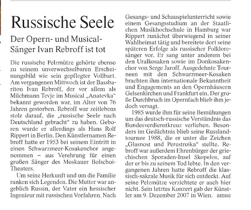 Klassische Musik: „Russische Seele – Der Opern- und Musicalsänger Ivan Rebroff ist tot“, erschienen in FAZ, Feuilleton 29.2.2008. Artikel als PDF-Download: FAZ Musik Russische Seele 29.2.2008