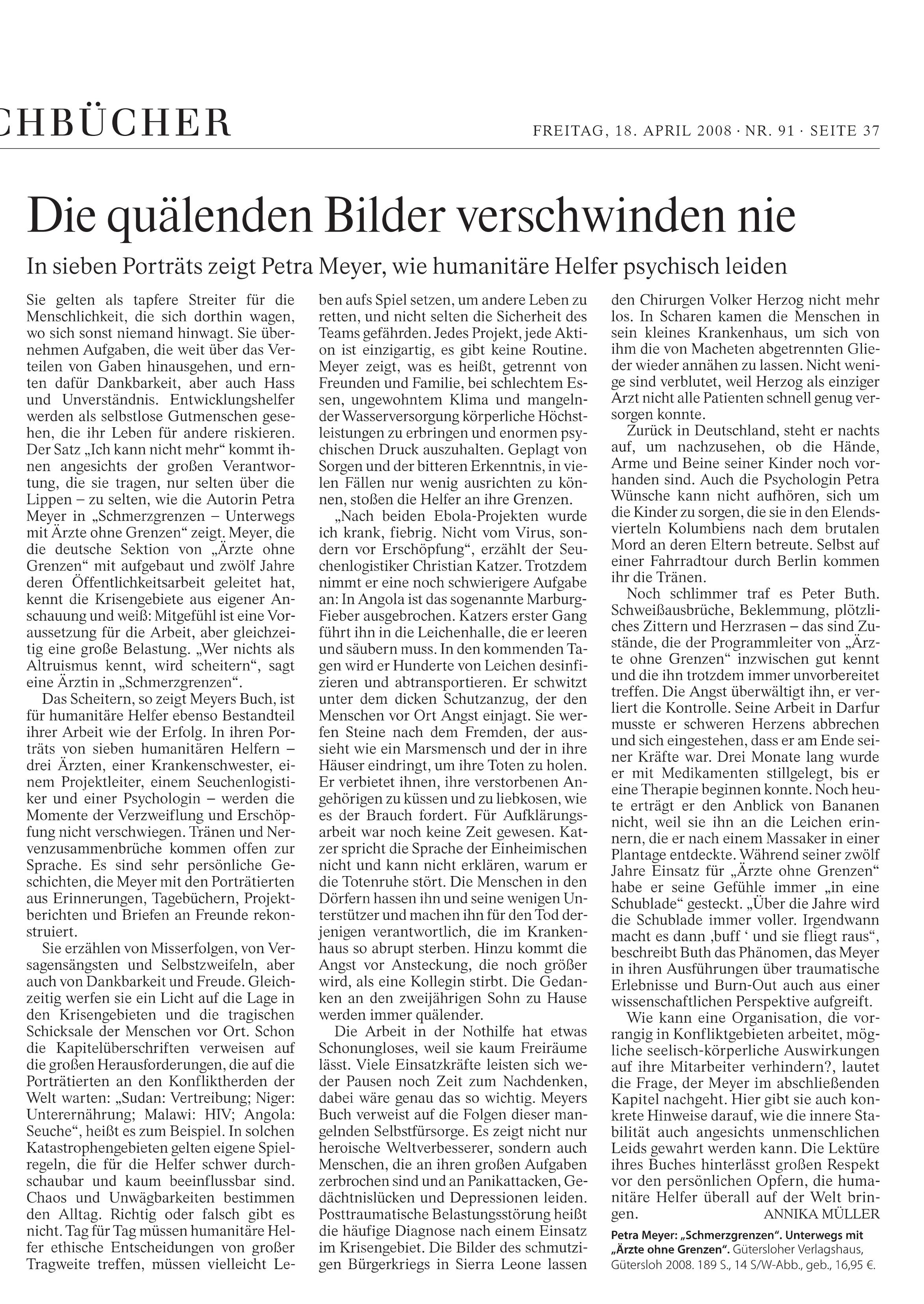 Sachbuchkritik Petra Meyer: Schmerzgrenzen- Unterwegs mit „Ärzte ohne Grenzen“, erschienen in FAZ, Feuilleton 16.4.2008: Artikel als PDF-Download: FAZ Sabu Petra Meyer 18.4.2008