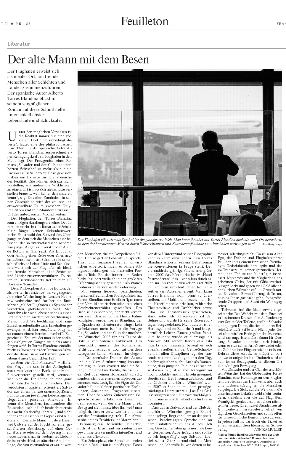 Literaturkritik Alberto Torres Blandina: Salvador und der Club der unerhörten Wünsche, erschienen im FAZ Feuilleton 10.8.2010