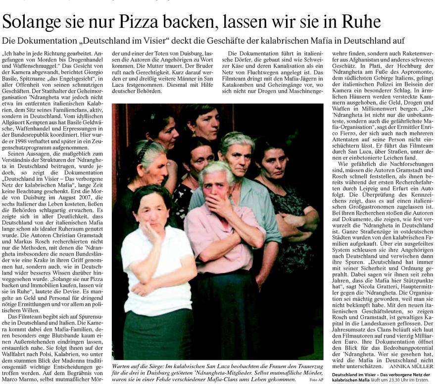 Fernsehkritik Deutschland im Vi sier – Das verborgene Netz der kalabrischen Mafia, erschienen in FAZ, Feuilleton/Medien am 2.4.2008. Artikel als PDF-Download:FAZ Fernsehkritik Deutschland im Visier 2.4.2008