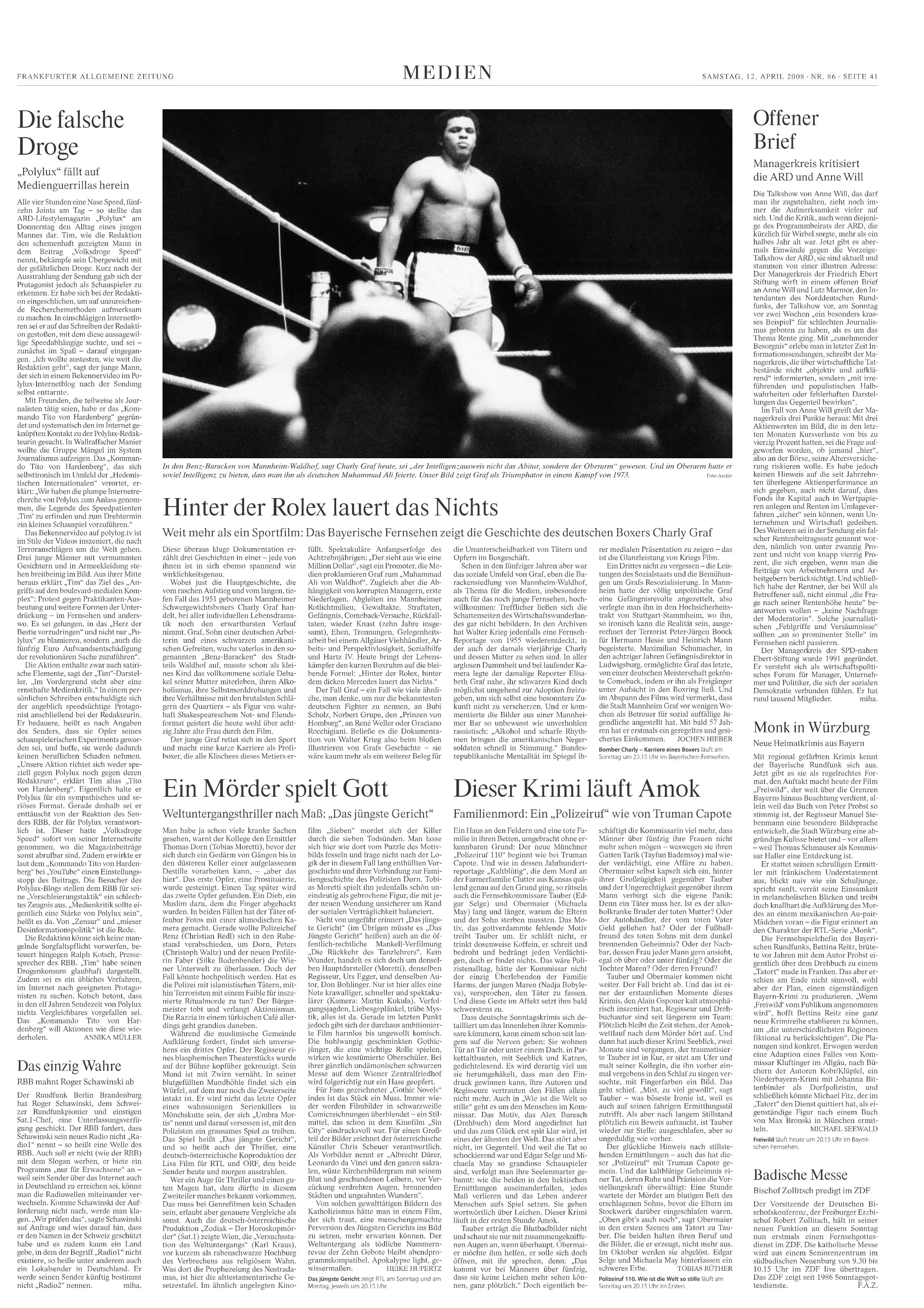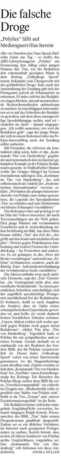 Medienkritik „Die falsche Droge-Polylux fällt auf Medienguerilla herein„, erschienen in FAZ, Feuilleton 12.4.2008: Artikel als PDF-Download: FAZ Medienkritik Polylux 12.4.2008