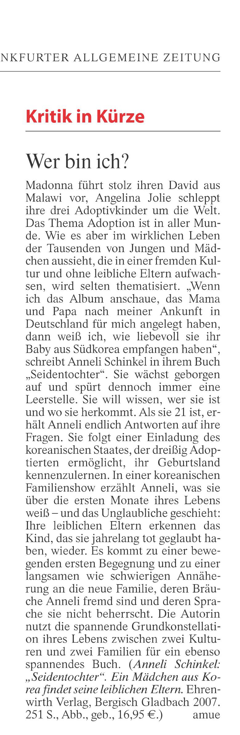 Sachbuchkritik Annelie Schinkel:Seidentochter erschienen in FAZ, Feuilleton 16.4.2008: Artikel als PDF-Download: Faz Kritik Annelie Schinkel 16.4.2008