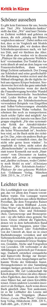 Sachbuchkritik Rainer Griese:Lesen ohne Worte erschienen in FAZ, Feuilleton 30.4.2008: Artikel als PDF-Download:FAZ Kritik Lesen ohne Worte 30.4.2008