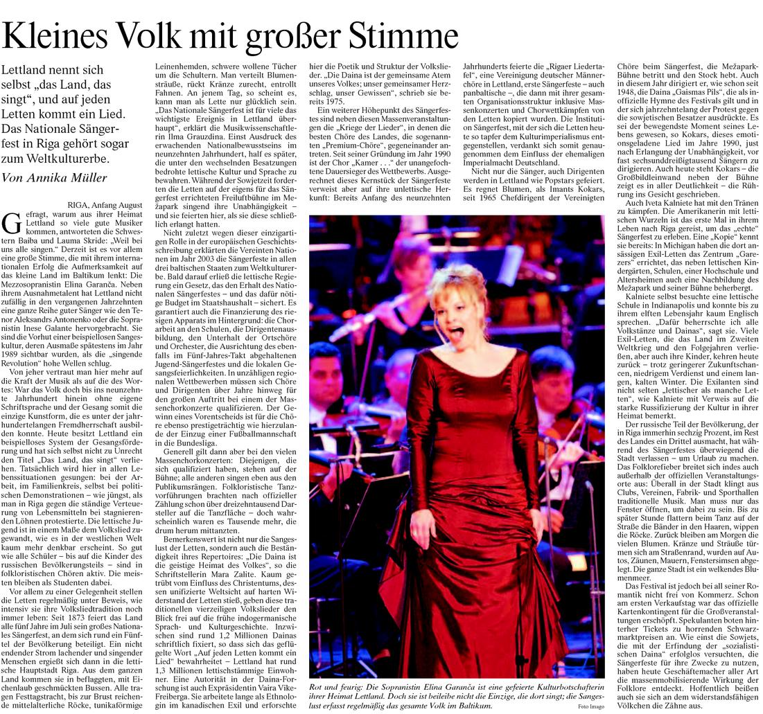 Kultur-Reportage Sängerfest in Riga: Kleines Volk mit großer Stimme, erschienen in FAZ Feuilleton am 5.8.2008. Artikel als PDF-Download: Faz Kulturreportage Riga Sängerfest 5.8.2008