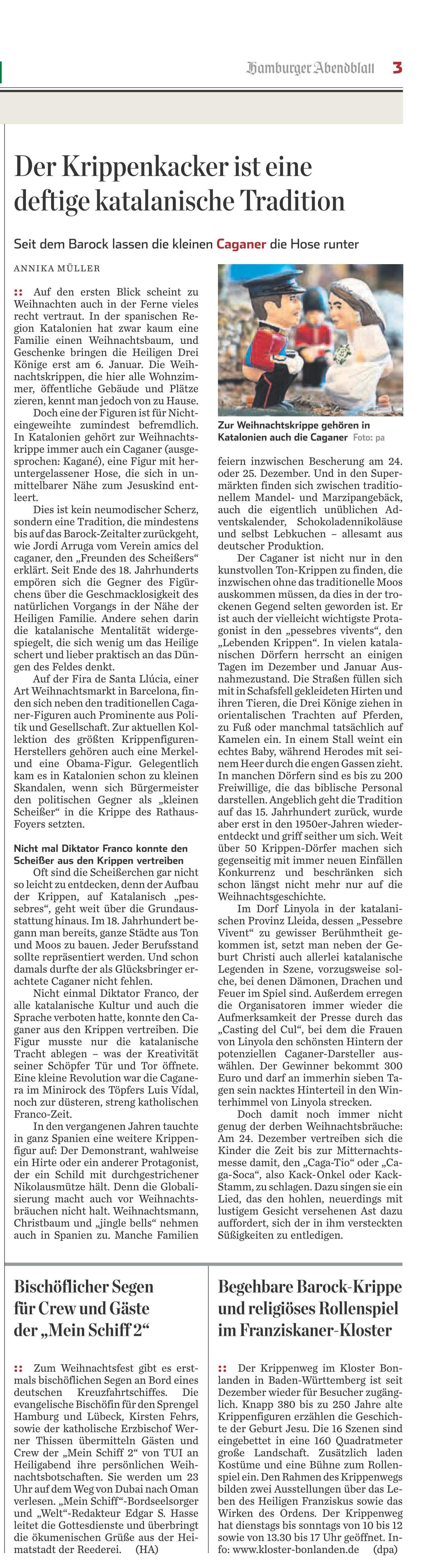 Weihnachtstradition Katalonien Hamburger Abendblatt„Der Krippenkacker ist eine deftige katalanische Tradition“, Hamburger Abendblatt, 22./23. Dezember 2012