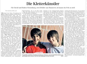 Die Kletterkünstler – Für David und Ruben Firnenburg, zwei Brüder aus Hannover, ist kaum ein Fels zu steil, erschienen in Hannoversche Allgemeine Zeitung, 22.3.2012. PDF des Artikels: Kletterk++nstler