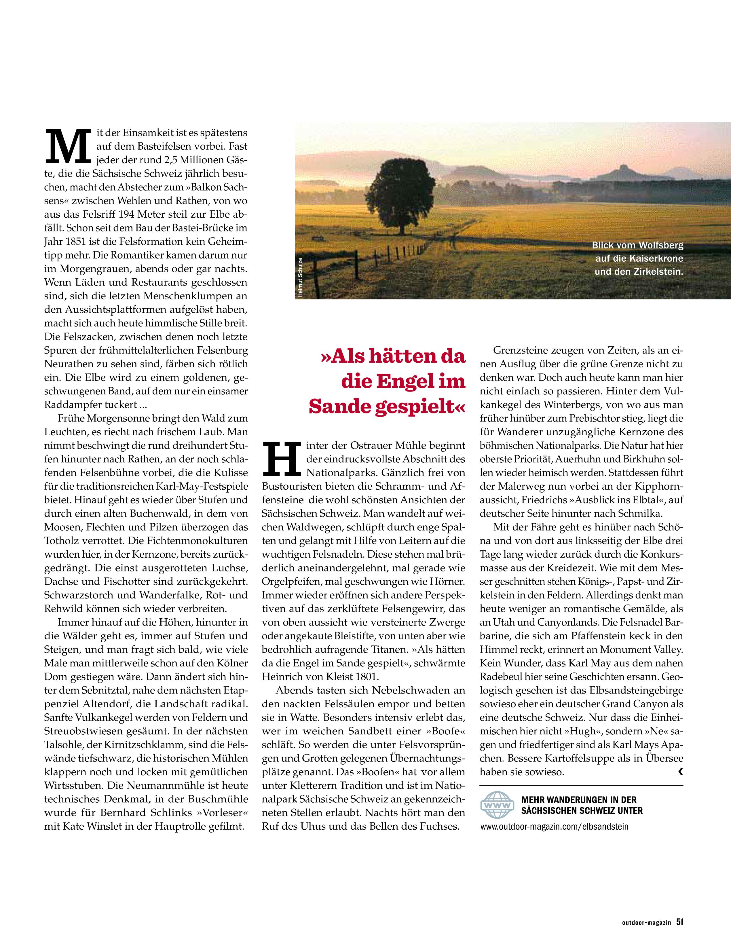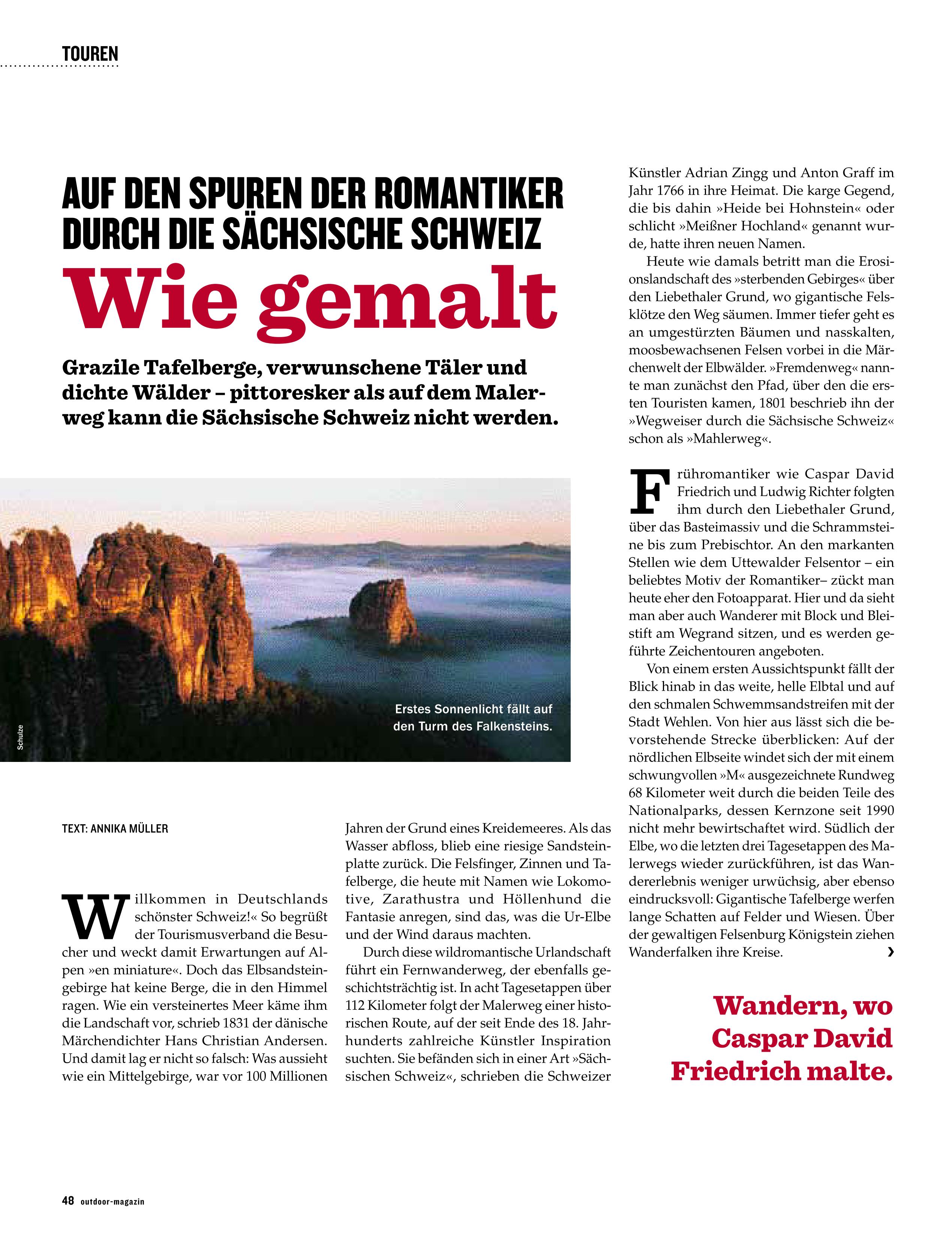 „Wie gemalt“- Auf den Spuren der Romantiker durch die Sächsische Schweiz, erschienen in Outdoor 10/2010 am 15.9.2010. Artikel als PDF-Download: OD_1010_ELbsandsteingebirge